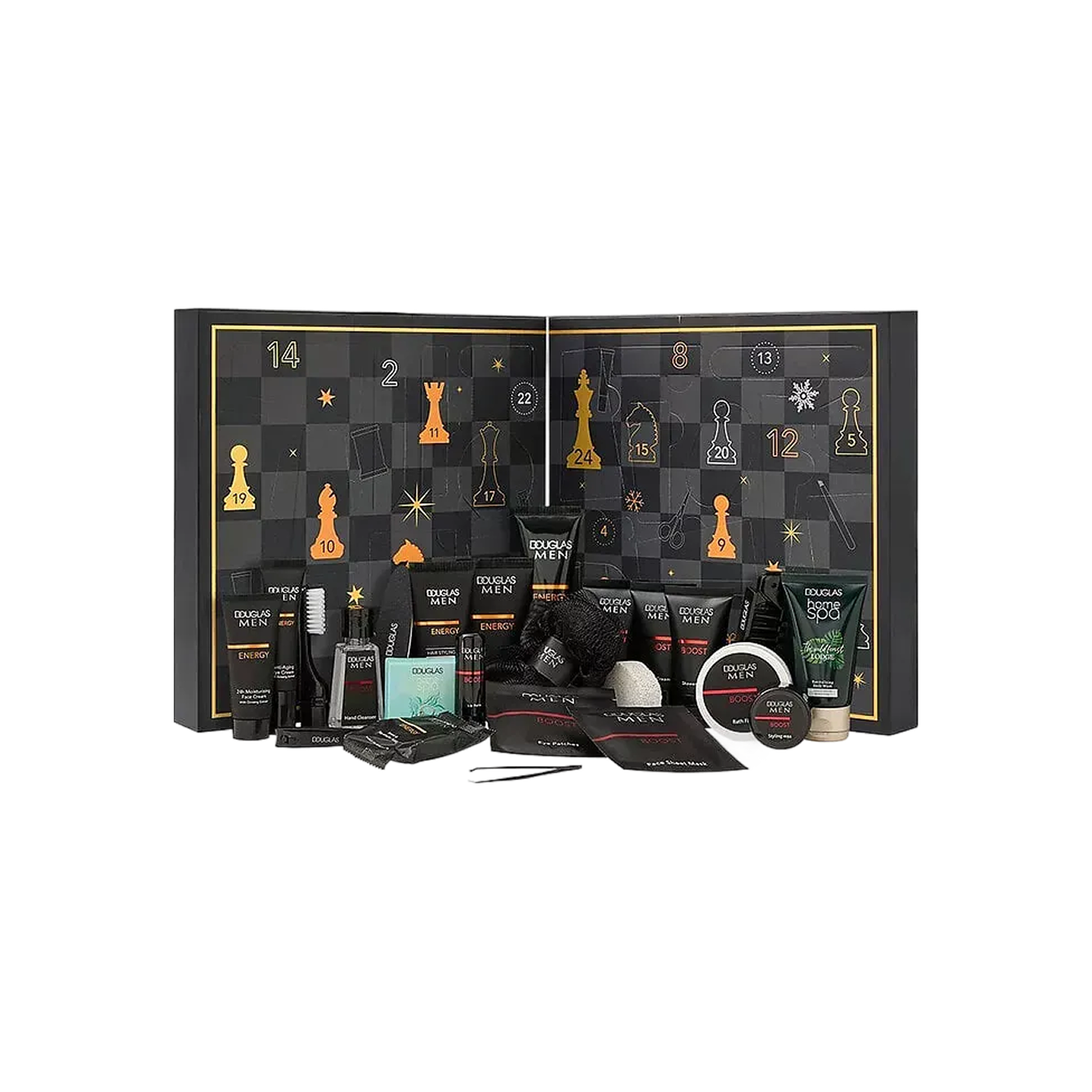 В подарочной упаковке — 24 уходовых продукта для мужчин. Среди них кремы для лица, лосьон для тела, бальзам для губ, воск для бороды, гель для укладки волос и патчи для глаз