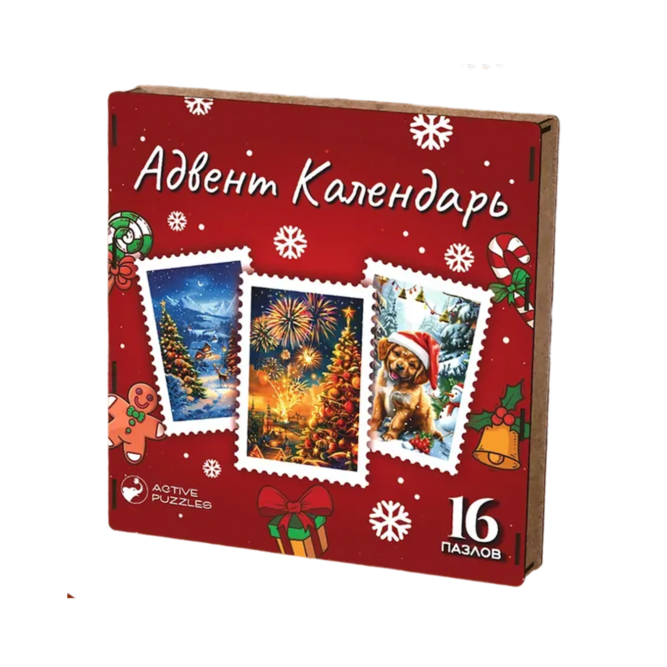 Внутри адвента — 16 деревянных мини-пазлов, похожих на новогодние ретрооткрытки. Когда соберется вся коллекция, можно использовать их как декор или преподнести в качестве праздничного сувенира близким