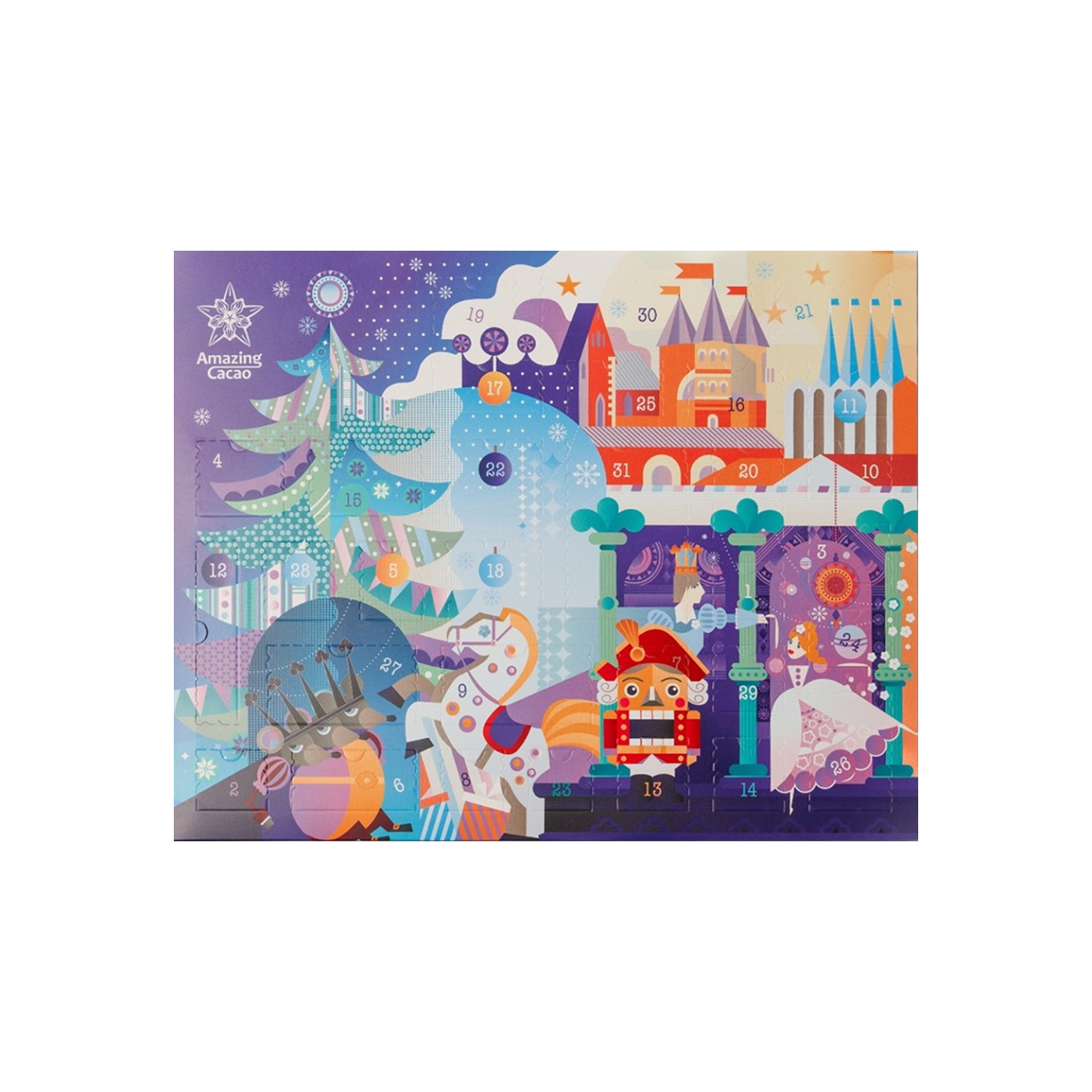 Дизайн коробки отсылает к балету «Щелкунчик», который неизменно ассоциируется с Новым годом. В окошках можно найти плитки и фигурки из разных видов шоколада: белого, горького, молочного и темного