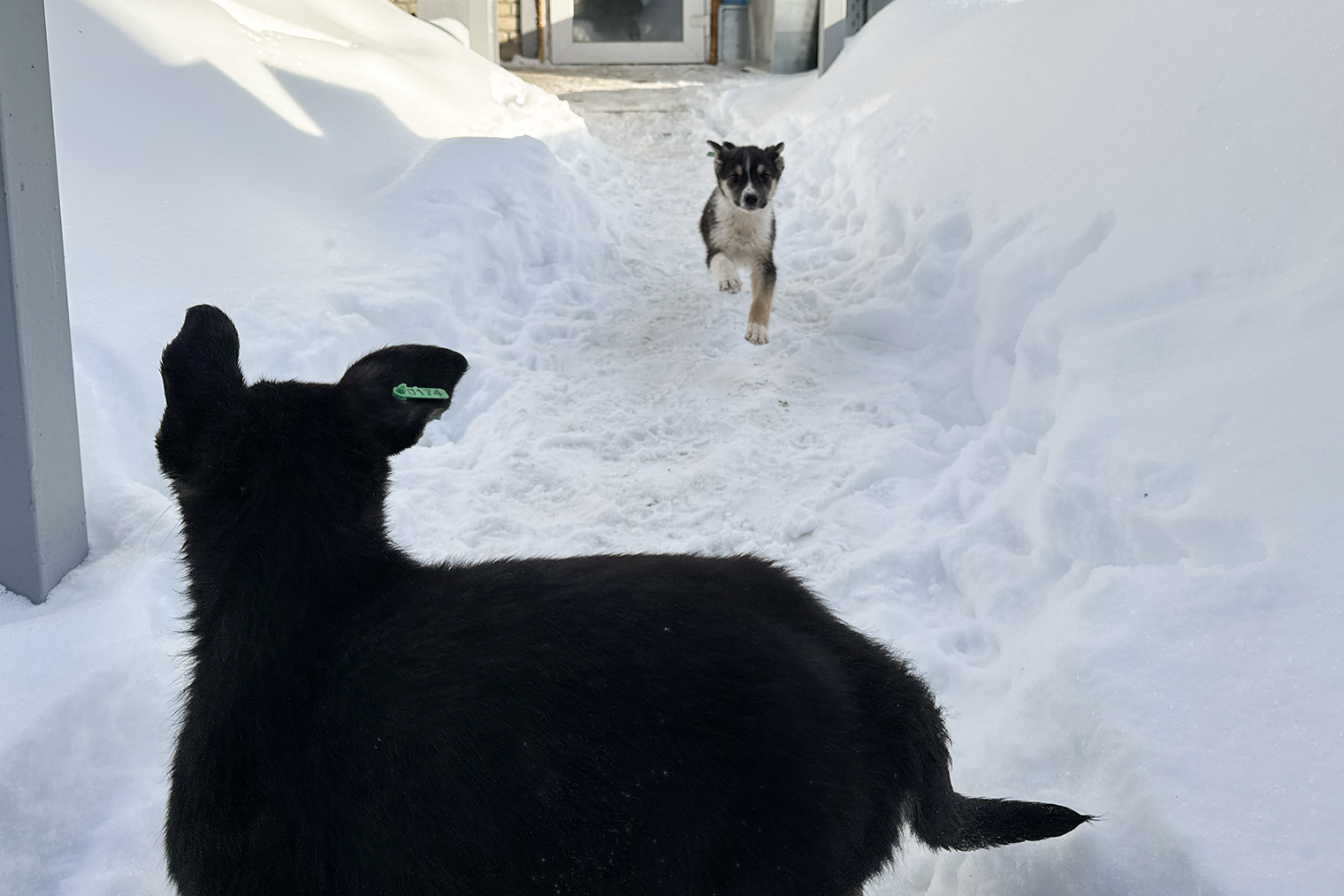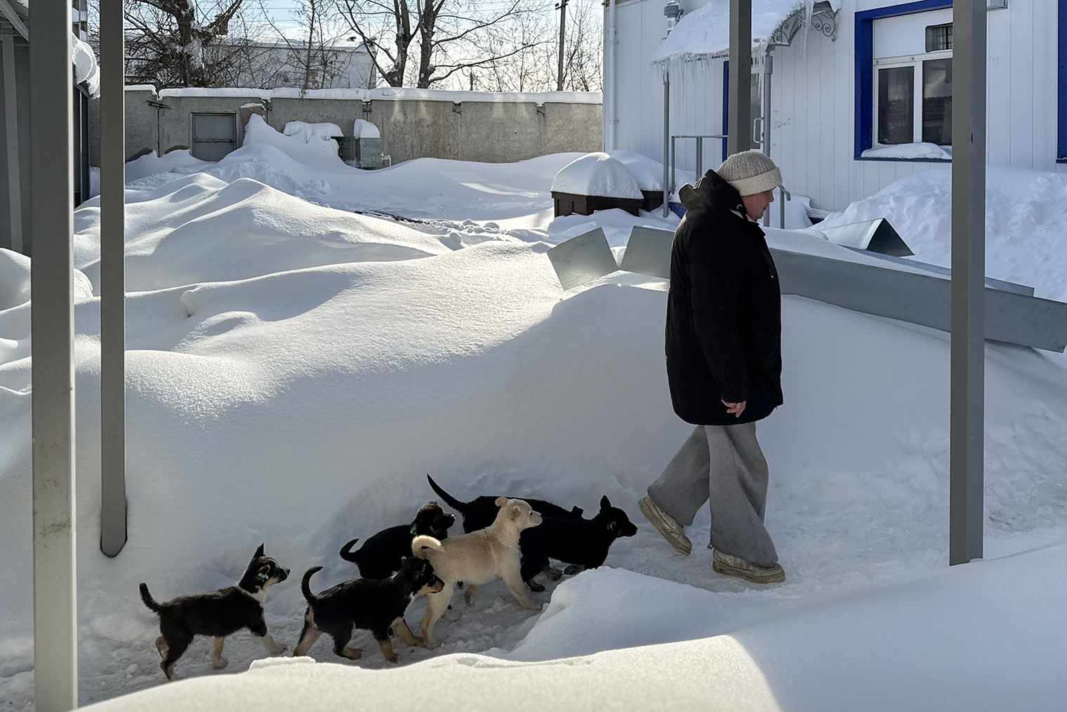 Сейчас они находятся в больших боксах — там их кормят и убирают за ними. Щенкам разрешают играть на улице, а сотрудники следят, чтобы у них не начали дрожать лапы: первый признак, что животным холодно.