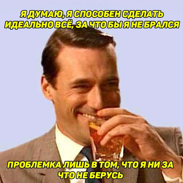Хэмм уже не в первый раз становится героем мемов. Еще в 2010-х завирусился кадр из сериала «Безумцы», где его персонаж Дон Дрейпер ухмыляется и пьет виски. За годы существования мем использовали по-разному, но чаще всего — чтобы показать некую циничность, элитарность и отстраненность от остальных.