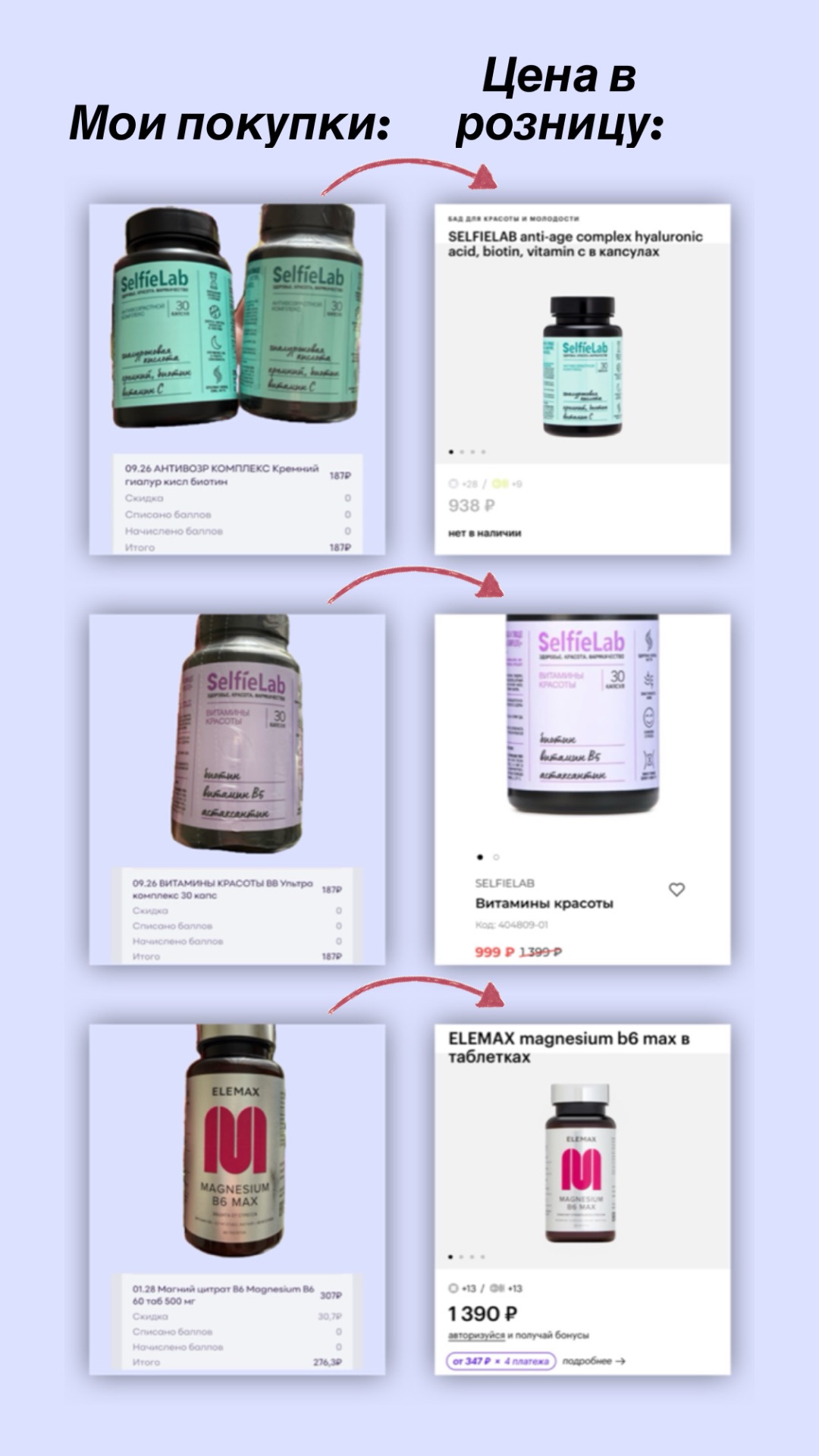 - Витамины красоты от SelfieLab с биотином, витамином В5, астаксантином, 30 капсул на месяц. Розничная цена от 999 ₽. Приобрела за 187 ₽. Срок годности, на момент покупки, ещё 8 месяцев.
