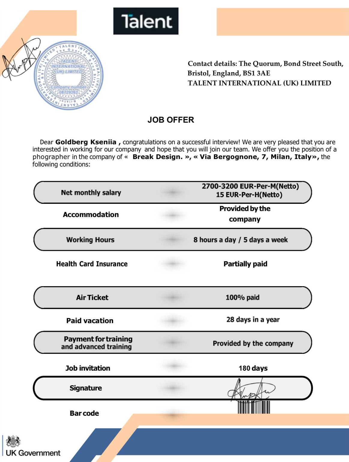 А дальше мне прислали приглашение на работу. Джоб-оффер от реальной компании с реальным адресом в Милане. Я загуглила. Компания занимается дизайном этикеток, никакой фотостудии с их именем не упоминается, вакансий на их сайте нет.