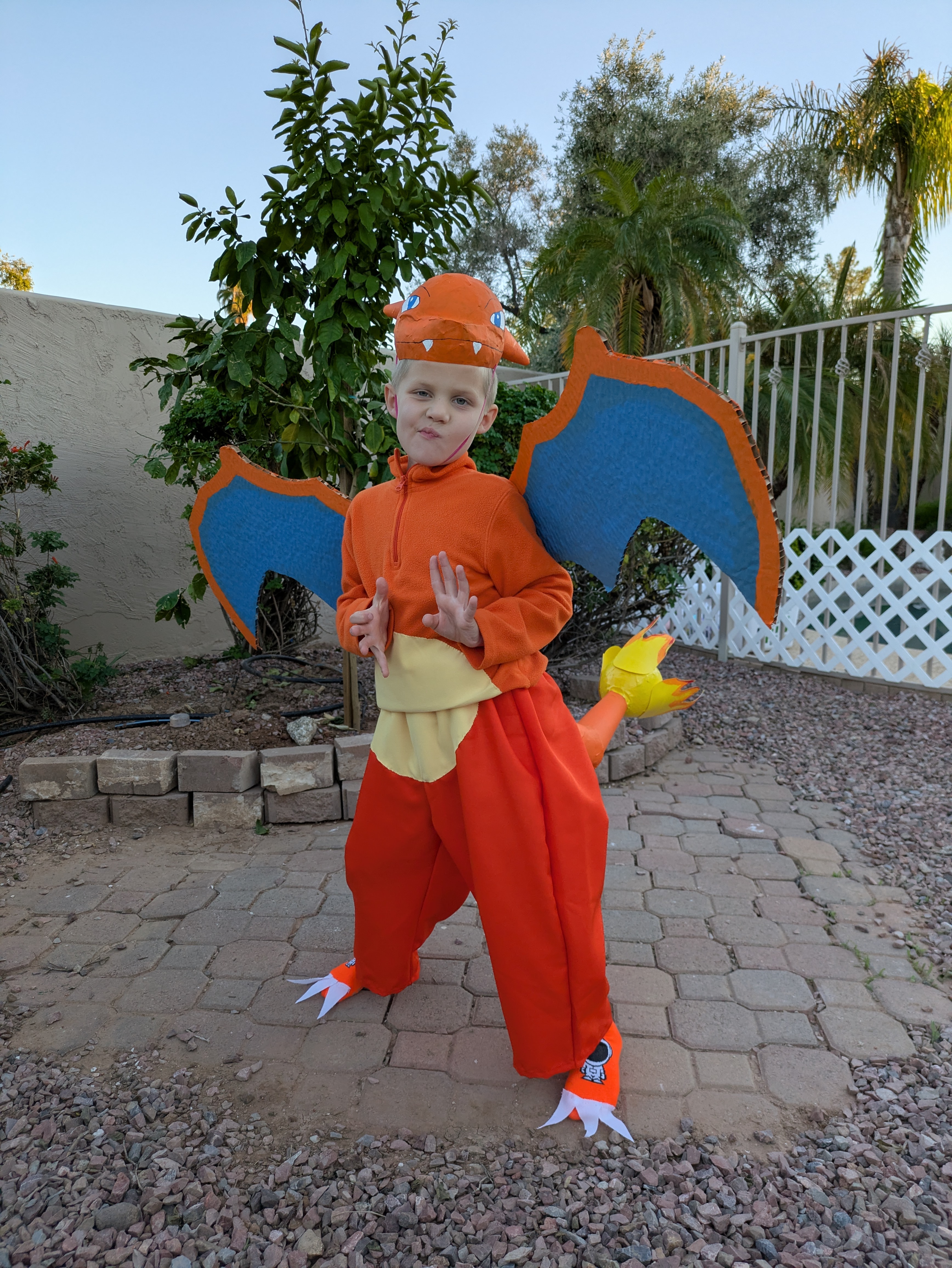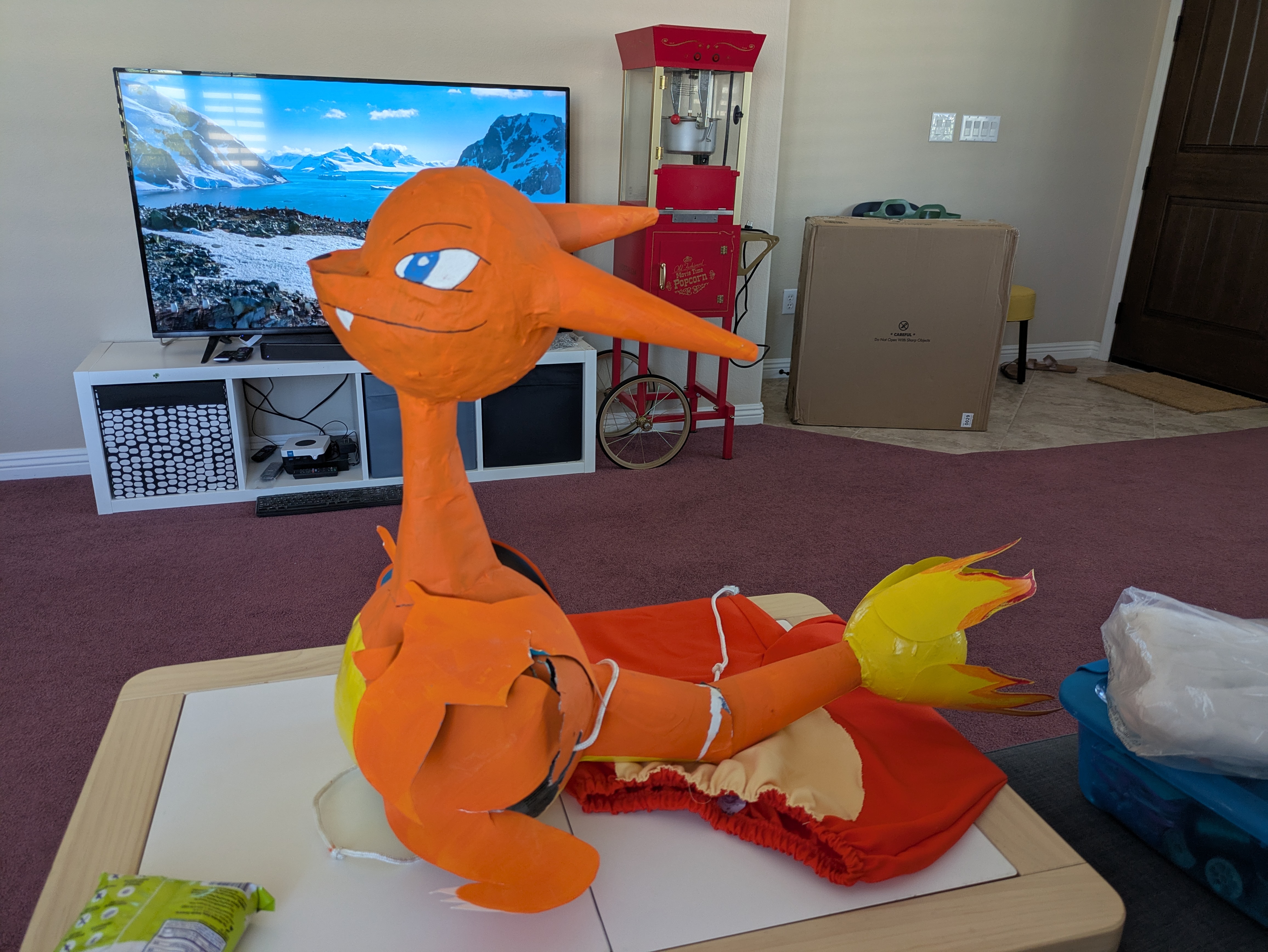 А костюм оранжевого покемона получился, пожалуй, самым трудоемким. В мае я делала пиньяту для старшего сына — из папье-маше, в виде Черизарда, это была моя самая сложная пиньята на данный момент. После разбития она довольно неплохо сохранилась, так что я оставила все, что смогла, — думала, может потом склею обратно. Но было решено пожертвовать ею в пользу предприятия: главными запчастями стали голова и хвост.