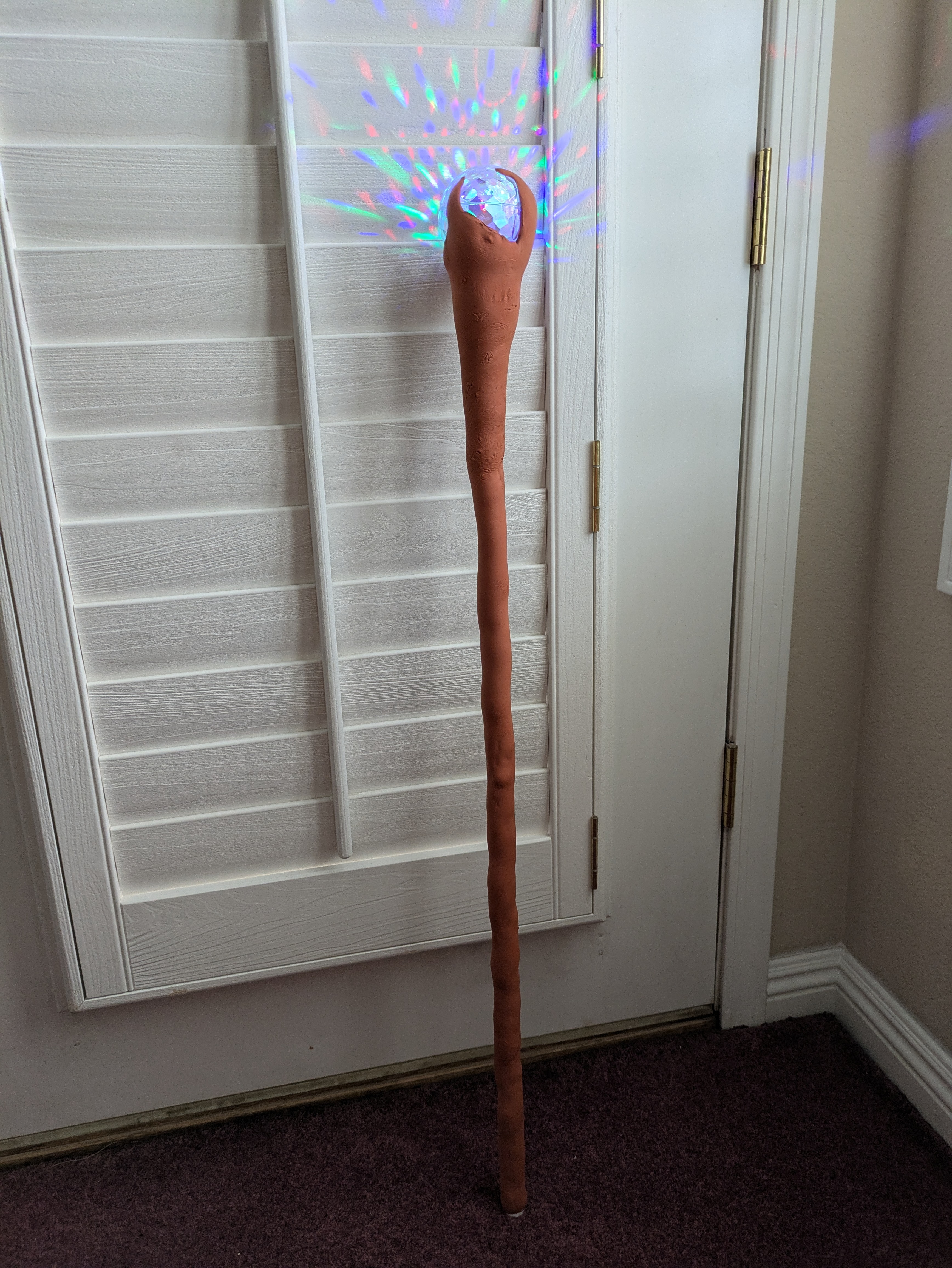 Еще Гэндальфу нужен был посох — я долго думала, из чего и как его сделать. С деревянным в школу не пойдешь, конечно, и хотелось, чтобы он светился. В итоге я нашла в гараже кусок старой штанги от занавесок подходящей длины, купила коричневую сохнущую массу для лепки — $14. А верхушку увенчала светящимся шаром, который на время одолжила у дочери из кукольного домика. Шар начинал искриться по нажатию кнопки, которую я замаскировала — сын потом сказал, что это был хит среди одноклассников.