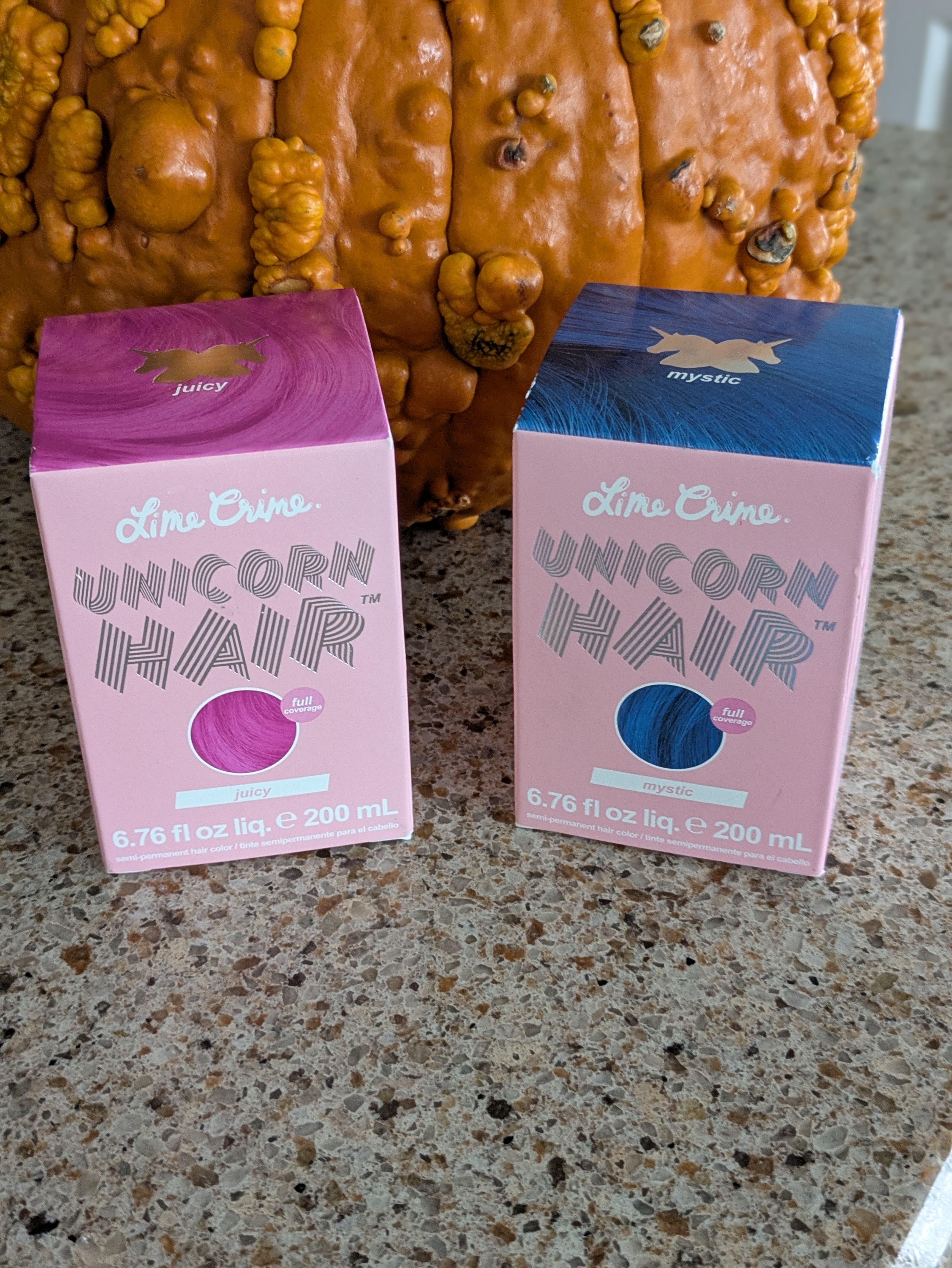 Аксессуары для Джесси из команды Р пришлось докупить: черные длинные перчатки и серьги обошлись примерно в $15. Розовая и синяя временные краски для волос стоили примерно $35. Первый раз в жизни я сама себе красила волосы, прямо в день Хэллоуина, и получилось довольно равномерно, хотя розовая краска не особо взяла русые волосы, поэтому цвет получился, скорее, фиолетовый. А муж в итоге отказался краситься — ну что с него взять, взрослый дяденька.
