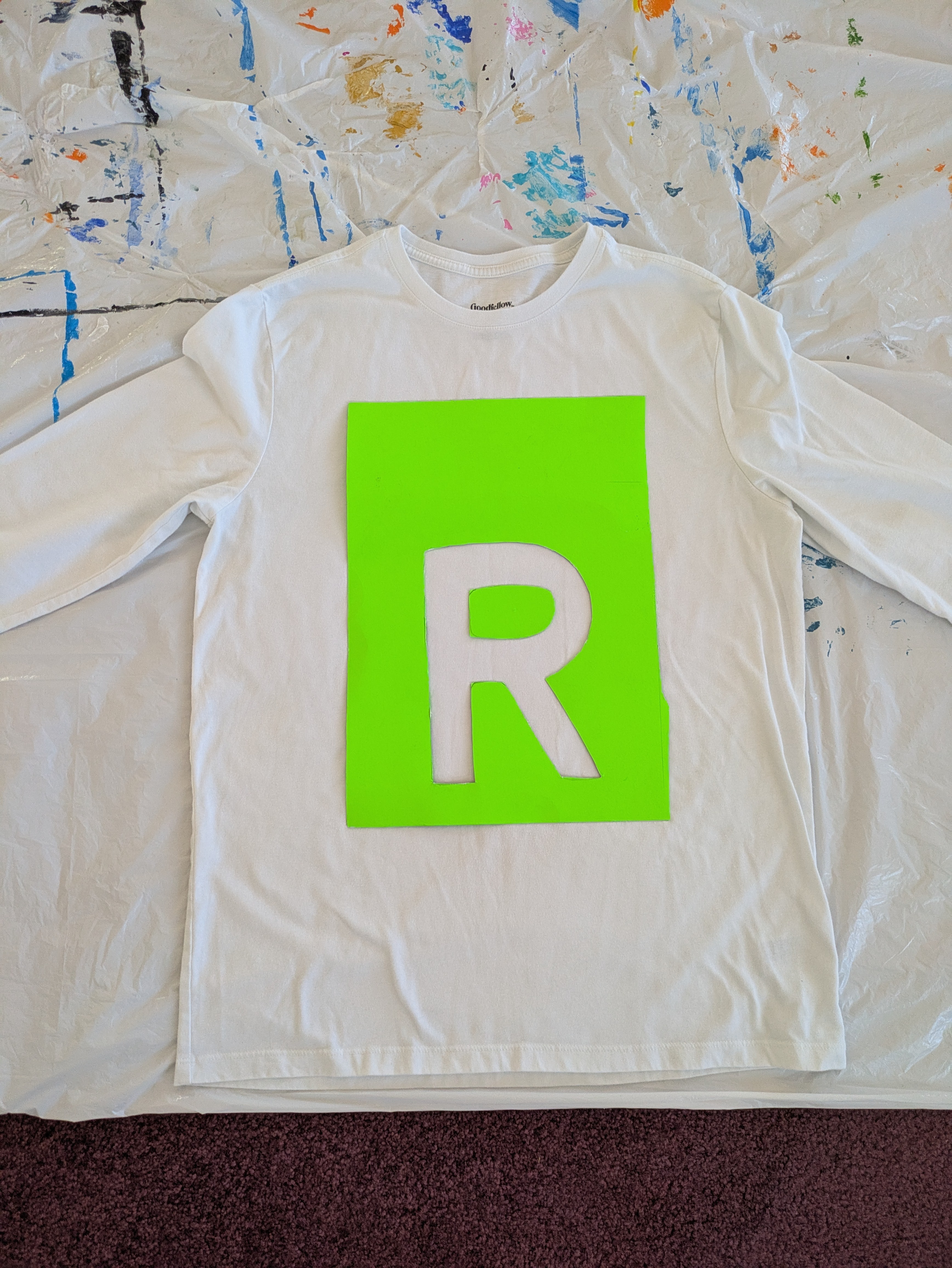 Для команды Р белую одежду и ботфорты купила в Гудвиле. Когда меряла разные ботфорты, было прямо неловко: одна женщина похвалила сапоги и мой выбор, я чуть ли не крикнула ей, что это на Хэллоуин, я такое не ношу в обычной жизни! На белых кофтах вывела красную букву R (опять трафарет из зеленого картона), чуть не покрасив заодно спинки — вовремя успела подложить внутрь… да-да снова зеленый картон.