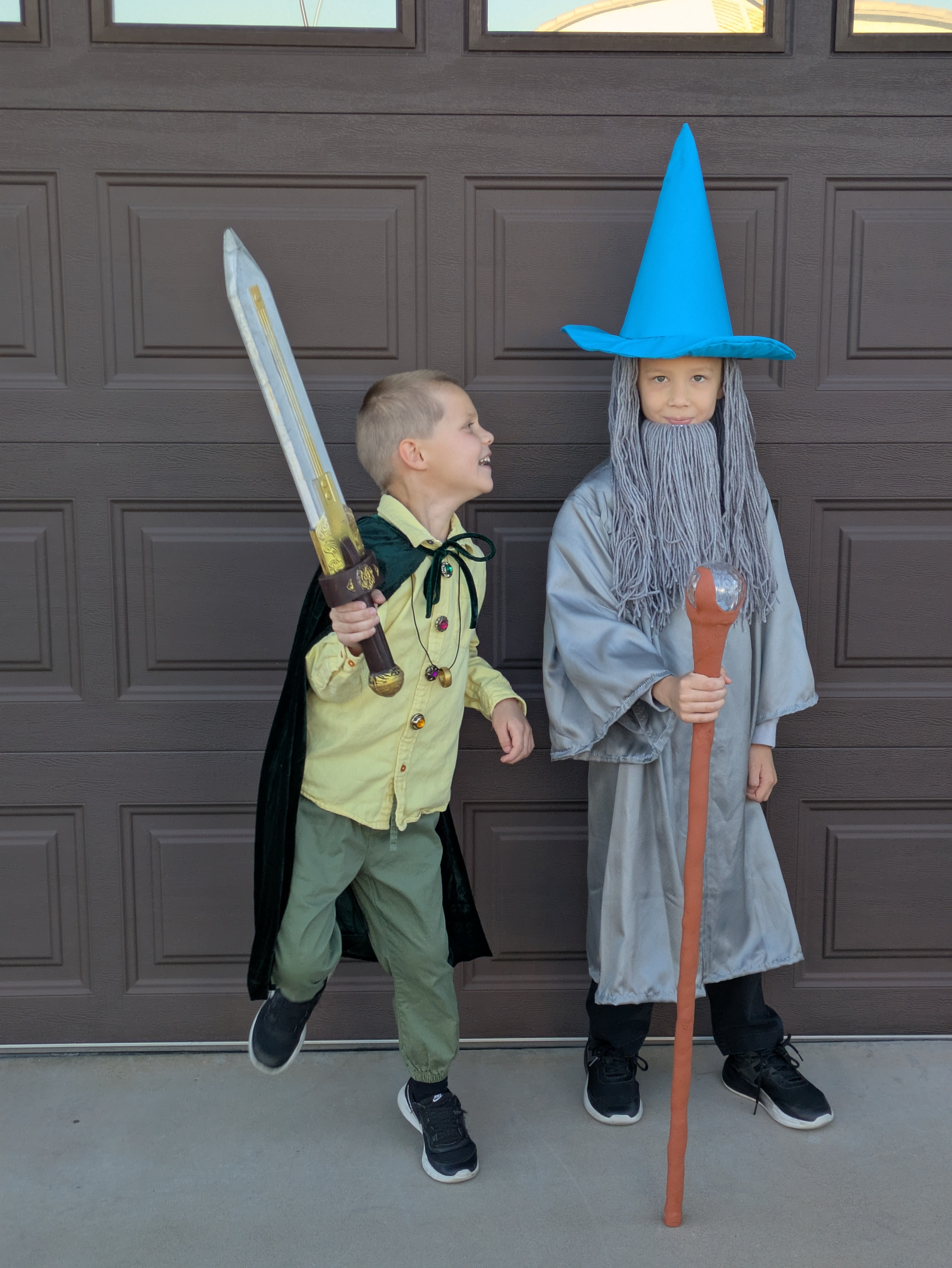 В этом году я планировала сделать из старшего сына Вилли Вонку, а из младшего — еще одного Железного дровосека, потому что у меня уже были топор, воронка и масленка. Но мы начали читать «Хоббита» и это был знак! Так что остановились на Гэндальфе и Бильбо.