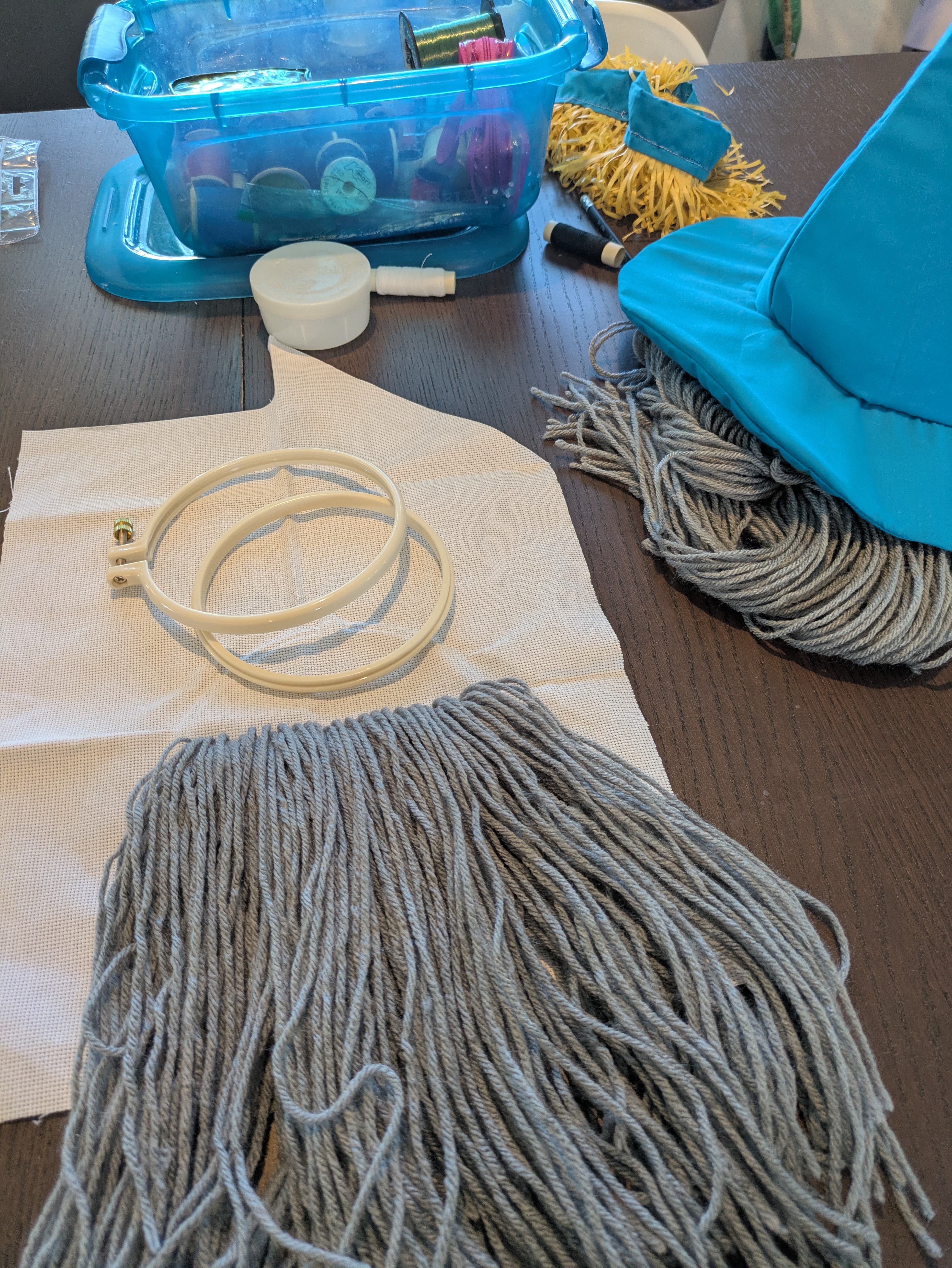 Синяя остроконечная шляпа у меня была: в прошлом году я сшила ее для костюма Страшилы. Но убор требовал переделки — я срезала со шляпы бубенчики, которыми так долго обшивала поля в прошлом году, и убрала желтые соломенные волосы — выбрасывать не стала, мало ли, вдруг еще пригодятся. Моток серой шерсти для волос и бороды Гэндальфа стоил около $10. Я нарезала пряжу на нити одинаковой длины и пришила их изнутри, оставив место для лица. Из этой же пряжи сделала бороду — нашила нити на канву, делала это при помощи пялец, т. к. с натяжением работать было удобнее. Первую бороду пришлось выкинуть: она получилась слишком густая, объемная и тяжелая.