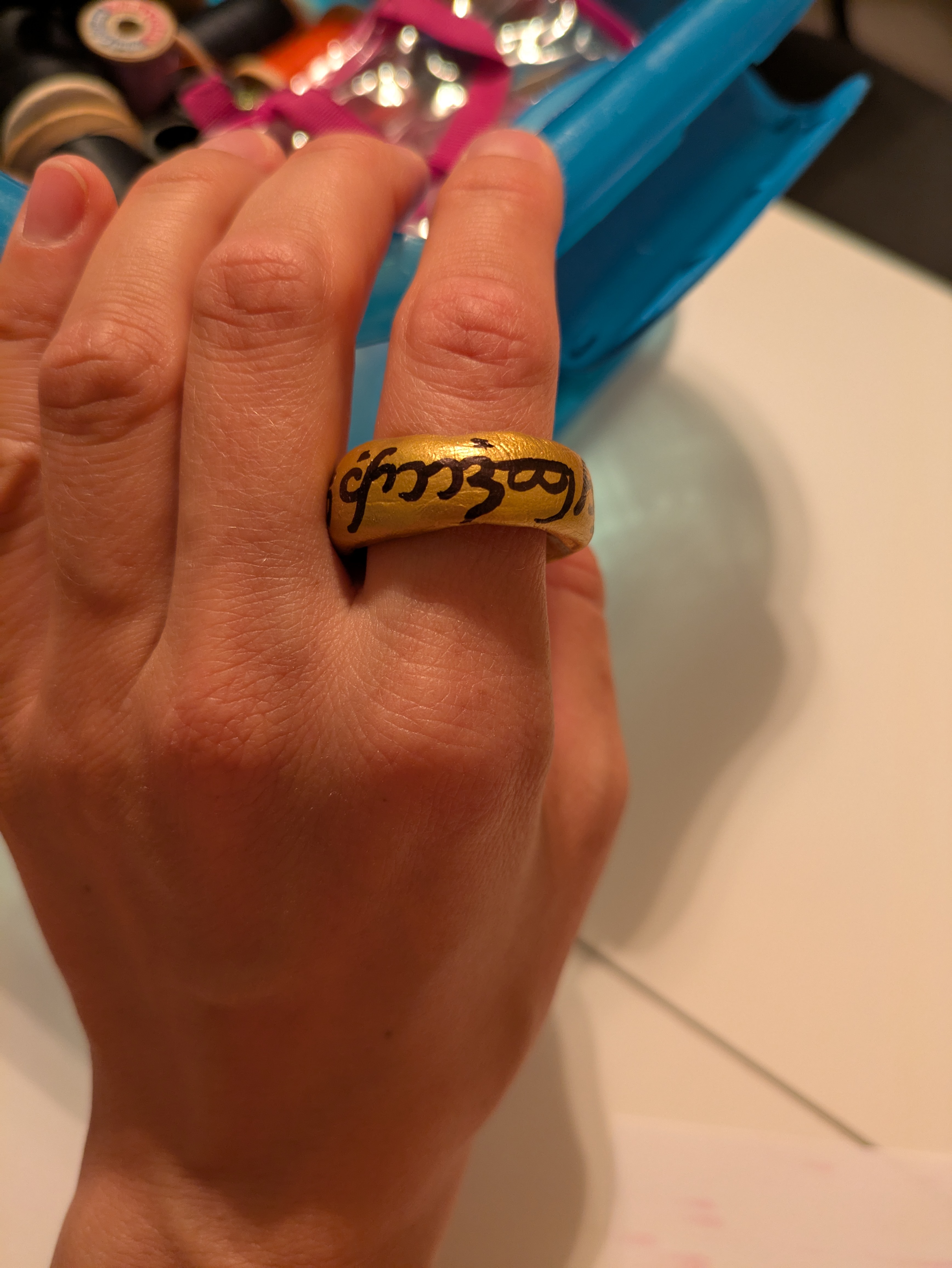 Оставалось сделать нашу прелесть, колечко. Я взяла пластмассовую пробку, отпилила кружок — остался обод, который я облепила массой и просушила. Получился крупный размер, как я и хотела, чтобы сын носил его не на пальце, а на шнурке, и чтобы на параде кольцо было лучше видно. Потом покрыла золотой краской, которая у меня оставалась от прошлых поделок, и нанесла черным маркером руны — как на кольце из фильма. Но мои забраковали такой вариант, так что пришлось снова покрывать чистым золотом. Сын с кольцом не расстается и после праздника, так что я начинаю что-то подозревать.