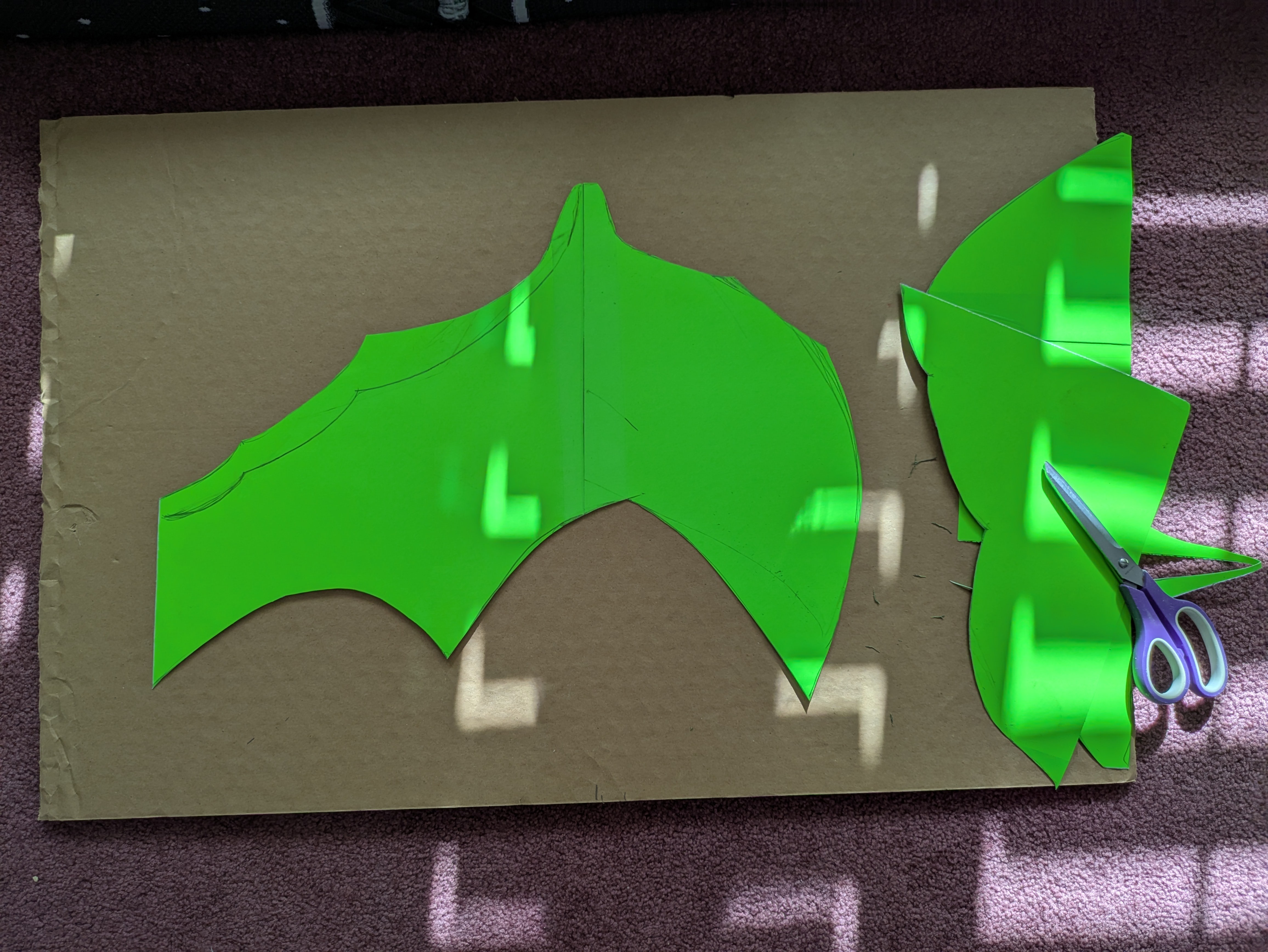 Оставалось самое сложное — Где твои крылья? Я сделала трафарет из зеленого картона, оставшегося от гаражной распродажи (про нее в прошлом посте). Вырезала два крыла, скрепила их третьей средней деталью и раскрасила в три слоя: банка оранжевого акрила стоила около $3, бирюзовый цвет развела сама из зеленых и синих красок. Закрепила крылья сзади на кофте примерно такой же функциональной заплаткой из остатков штанов. И вуаля!