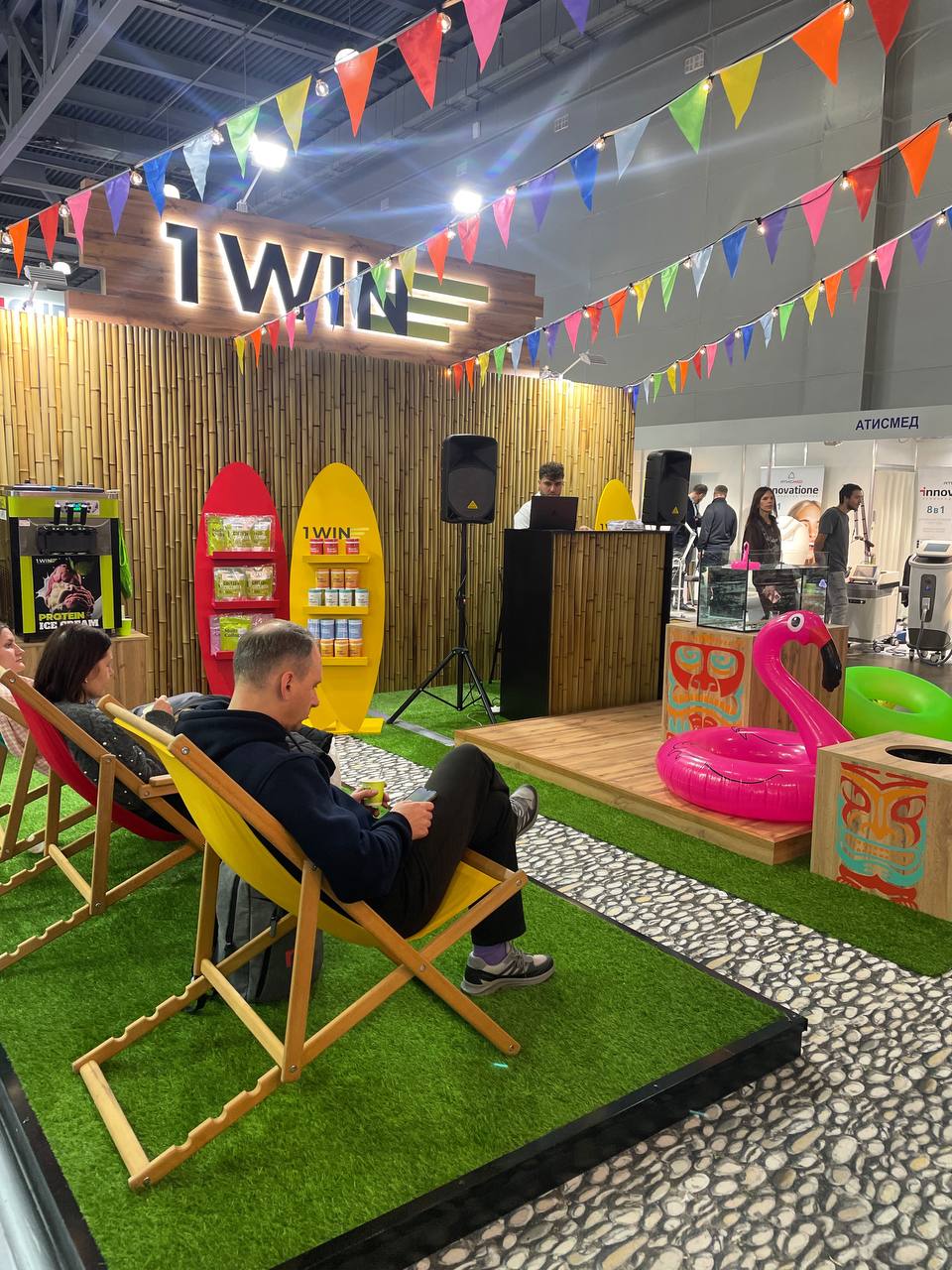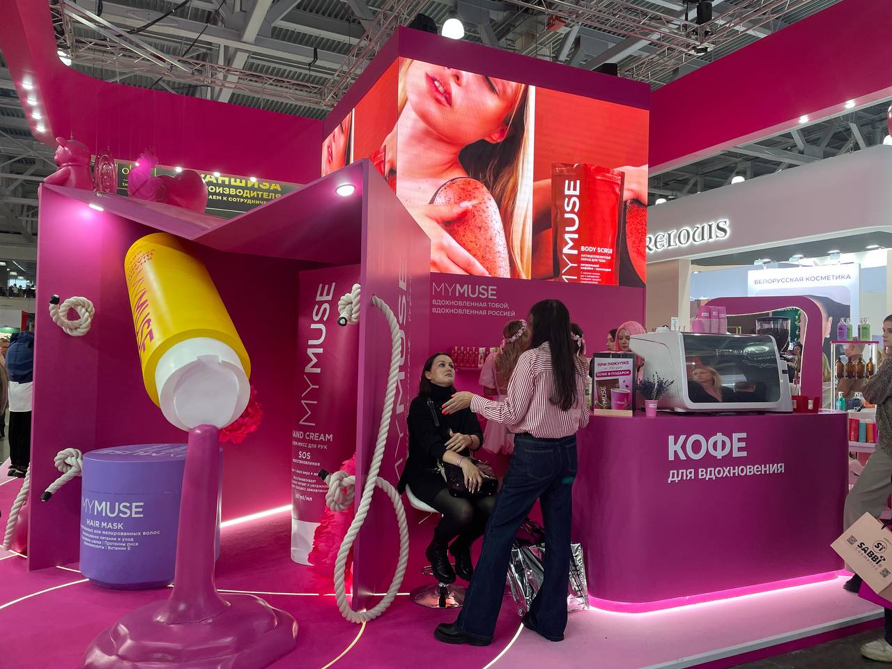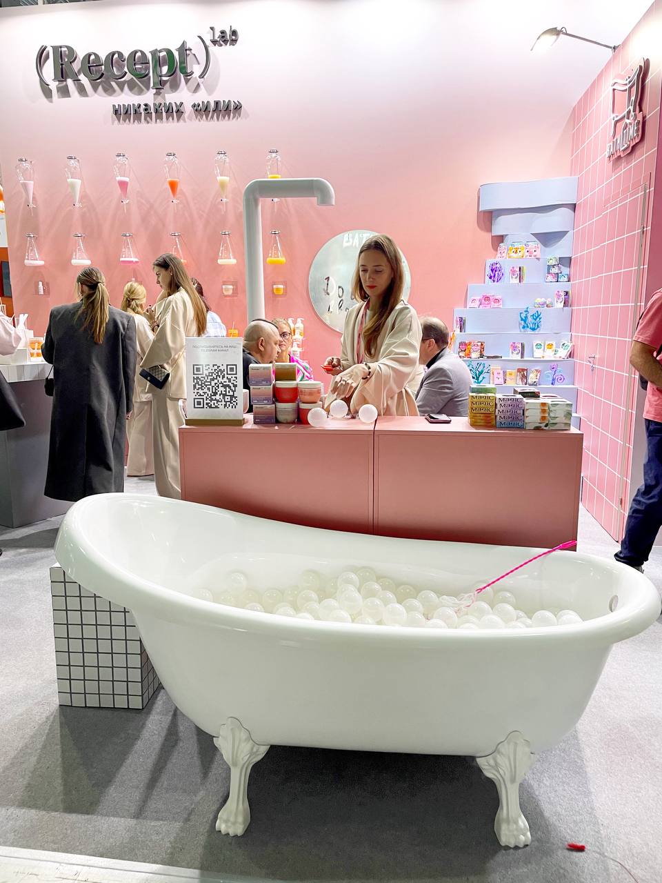 Стенд Recept меня привлек своей химической экспозицией и белой ванной с белыми шарами, при этом консультант не захотела пообщаться и рассказать, на чем специализируется компания, единственное, что я поняла, что одно из направлений — это сексуальная косметика The LUFF с яркими тубами. Об этом тоже история умалчивает, так как девушки были заняты беседой. Я пошла гулять дальше.