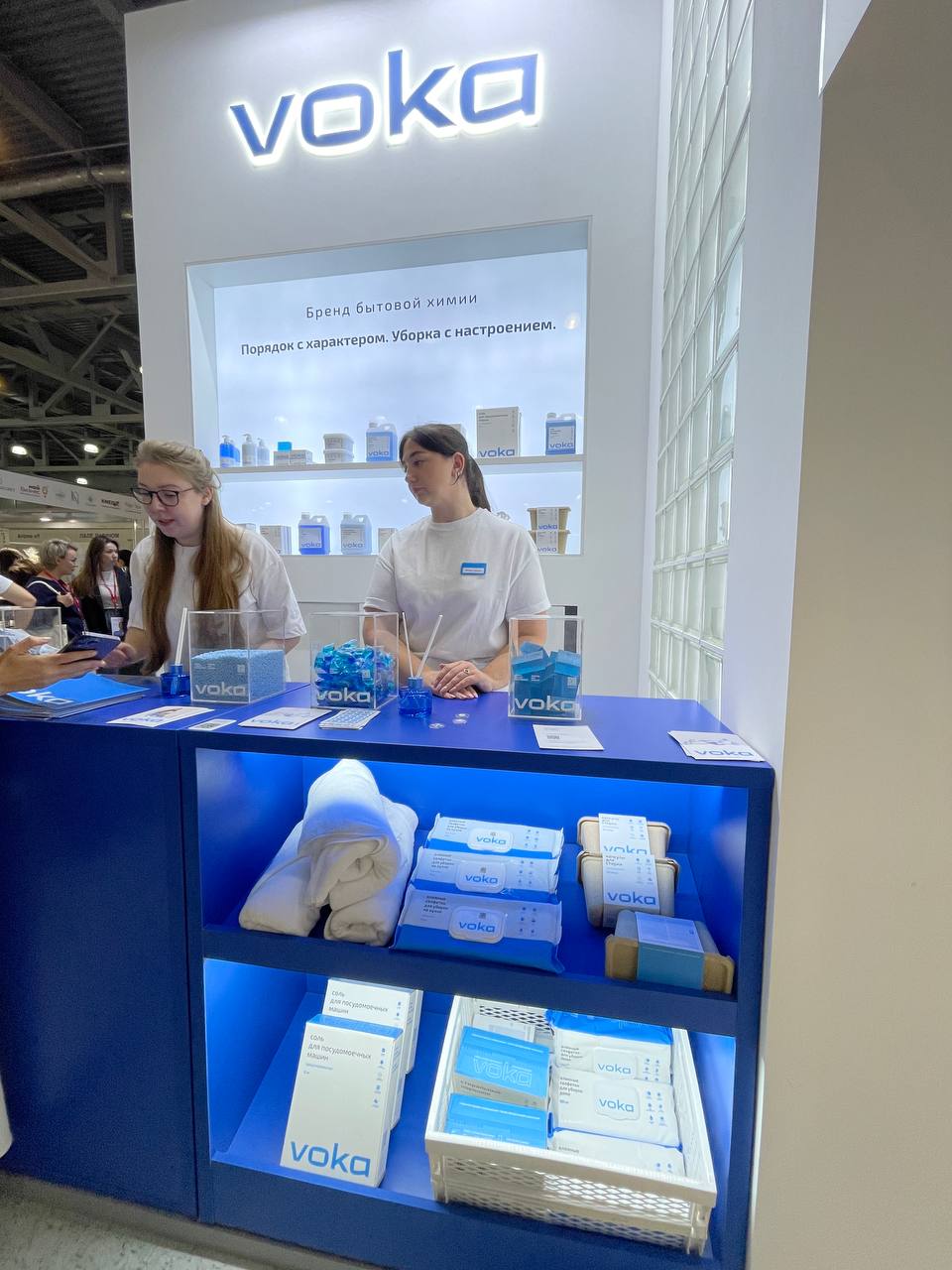 Следующий стенд, который привлек мое внимание ароматов и улыбками сотрудников — это сине-голубой бренд Voka — производитель бытовой химии. От этого бренда я впервые узнала, что существуют листы для стирки. Палитра продуктов широкая, хотя компании всего год, есть таблетки для посудомоечных машин, средство для мытья пола, соль для посудомоечных машин, крем для рук и многое другое. Судя по ароматам продукции, бренд классный.