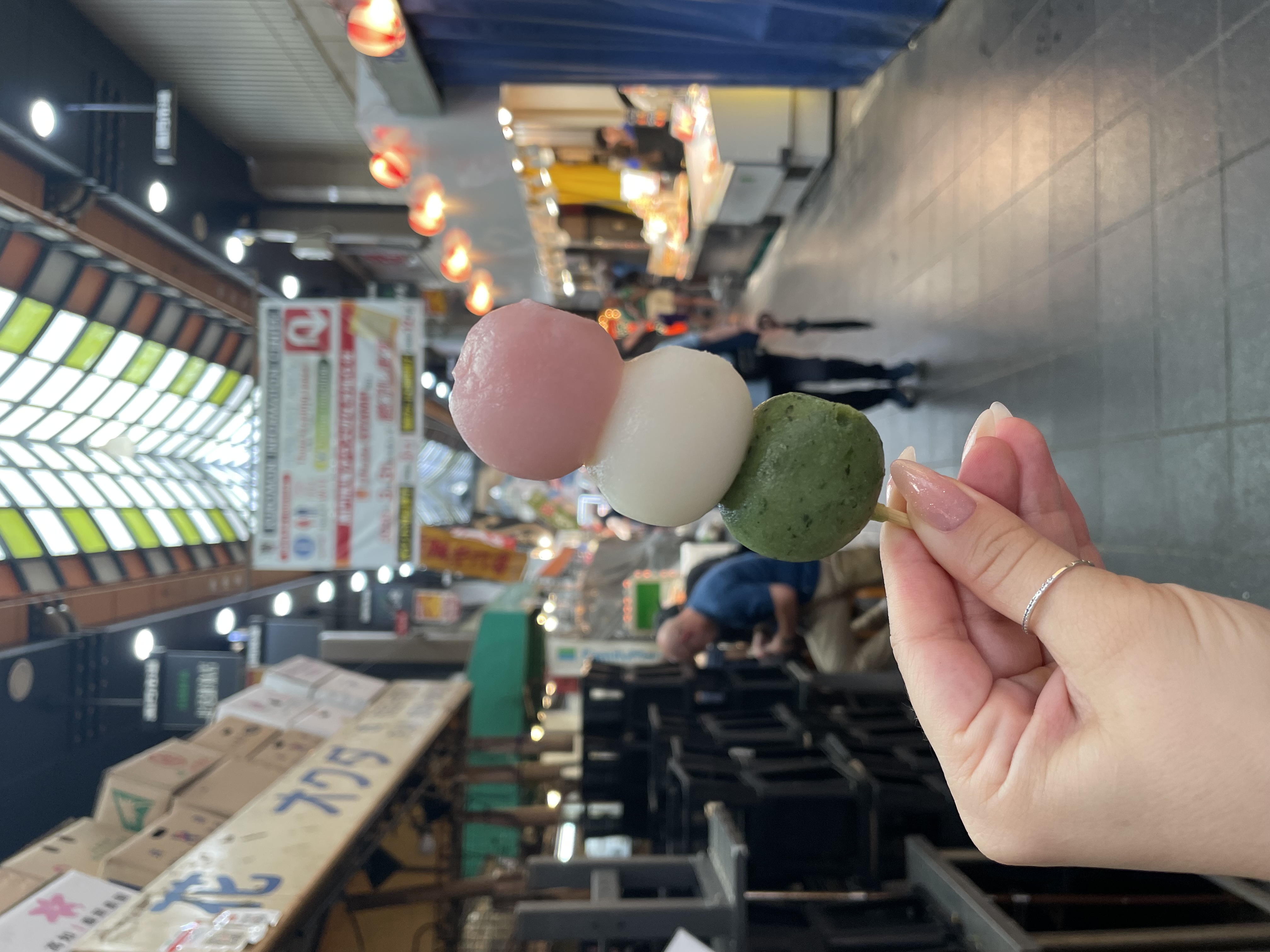 На обед зашла в первое попавшееся место на рынке Куромон и заказала сакедон (рис с лососем) за 920 иен, какая мягкая была рыбка… Там же наконец купила попробовать вот этот эмодзи 🍡 за 300 иен, никаких ожиданий не строила, но оказалось вкусно! Каждый шарик со своим вкусом.