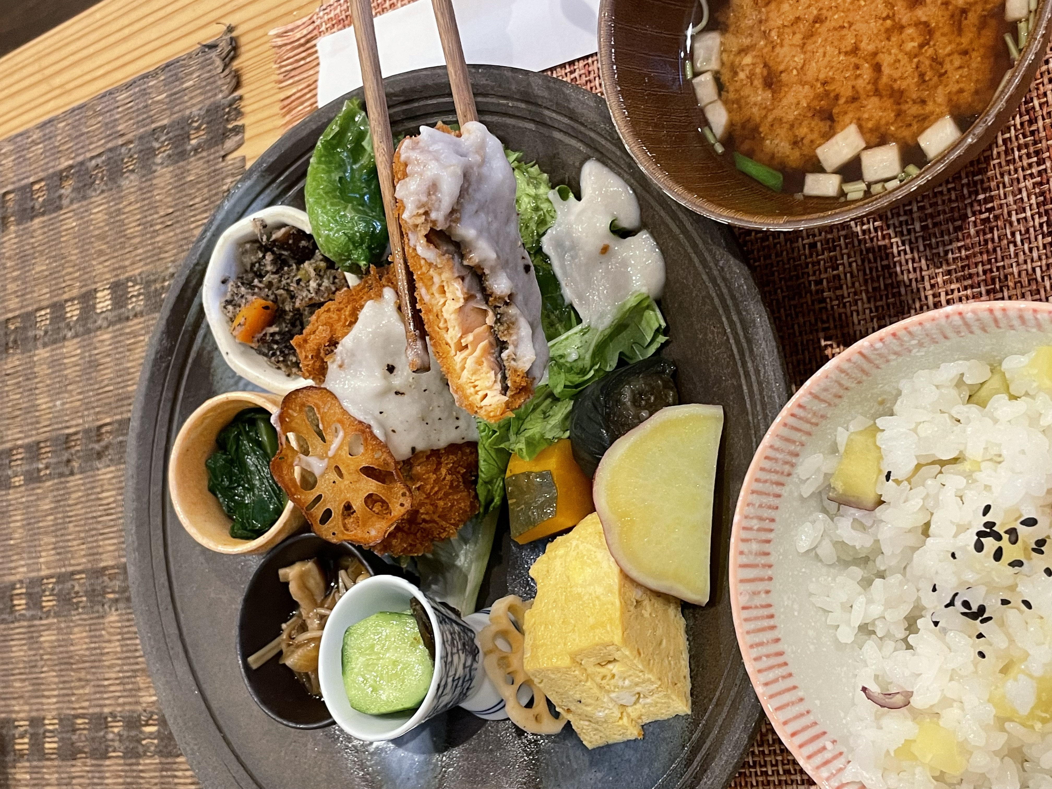 На обед зашла в случайно выбранное место на карте и еда там оказалась лучшей за всю поездку. 2650 иен за кацу из лосося, рис с бататом, и снова куча овощных закусок. Хочется вернуться в Нару хотя бы ради того, чтобы снова поесть в этом заведении.