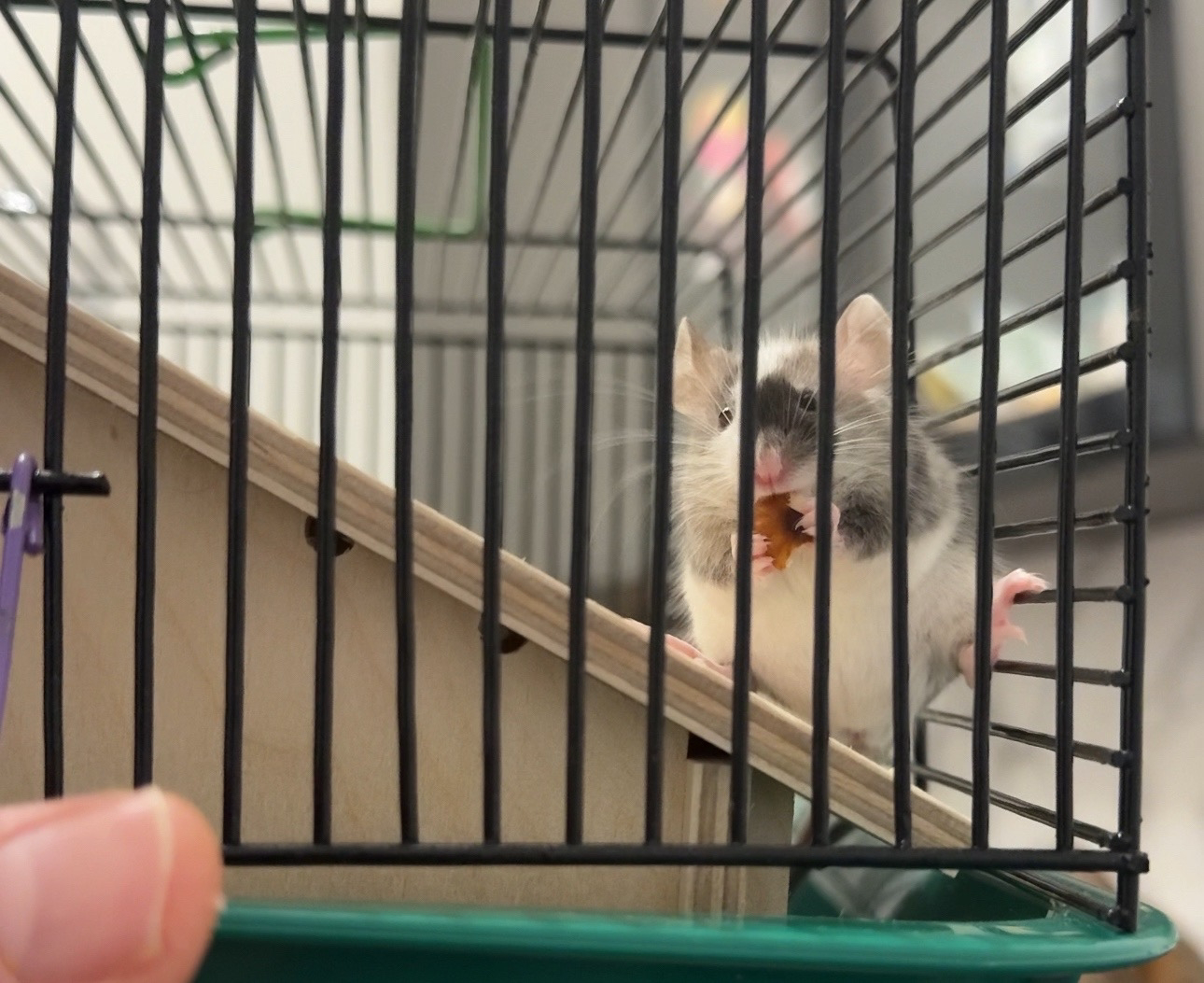 О переноске. Мы к врачу ездили с переносками. Арсения в клетке своей маленькой, в которой провела первые 2 недели жизни у меня. Для переноски такая клетка даже очень большая, подходит. А Элджернон в специализированной переноске ездил. Элджернон прогрыз эту переноску на раз-два, тканевые переноски грызунам не подходят!