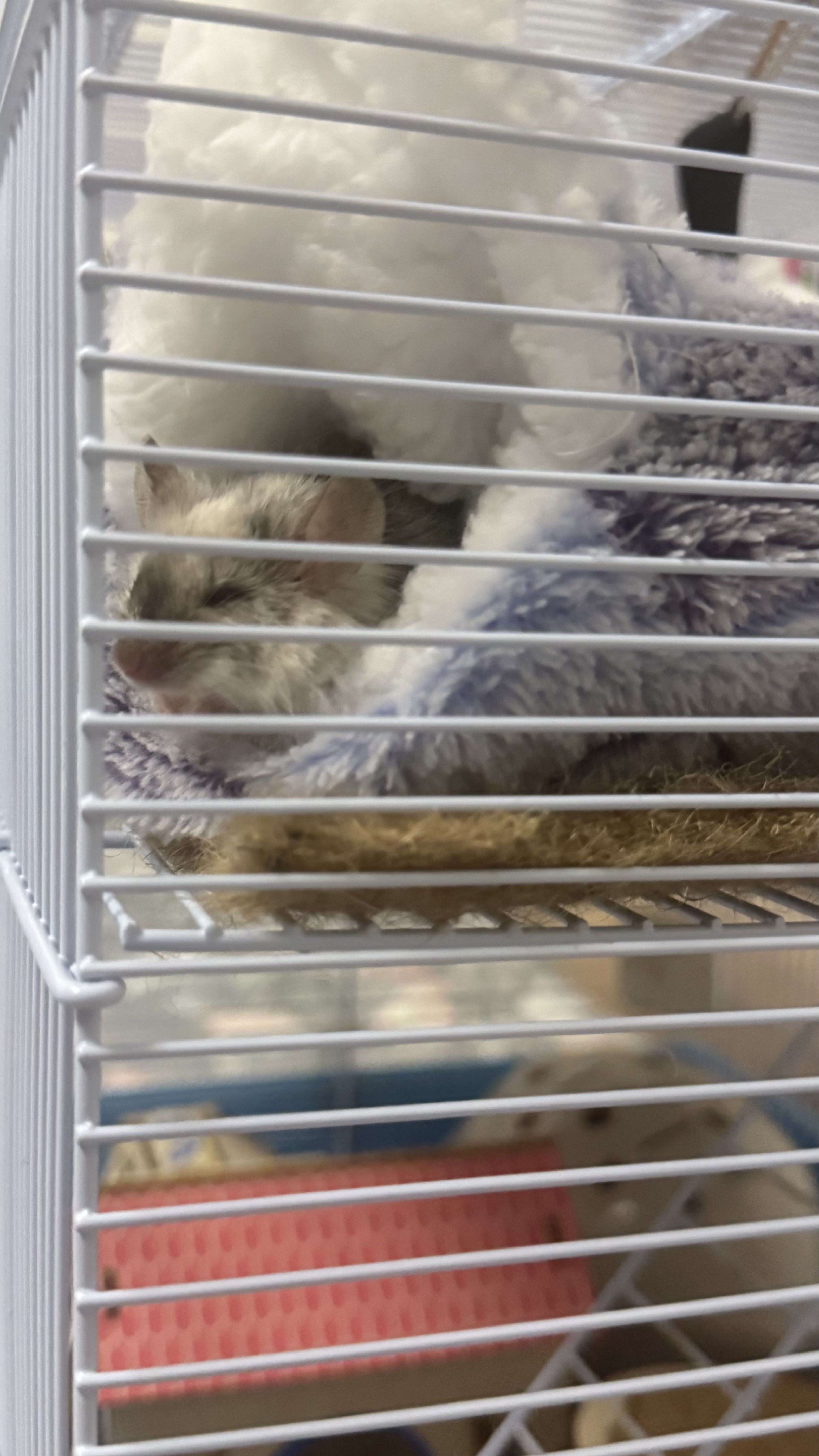 У Арсении в клетке 2 беговых колеса, диск беговой, качели, 2 гамака, 2 поилки, 2 миски, 2 минеральных камня, 2 домика, тоннель, веточки деревьев, игрушки.