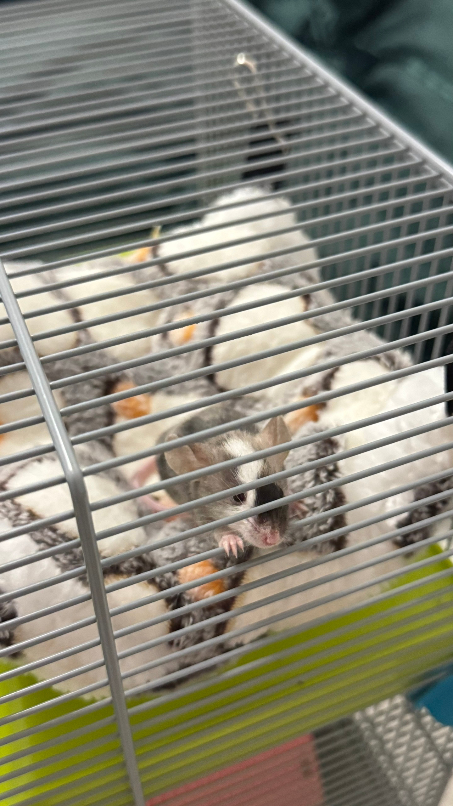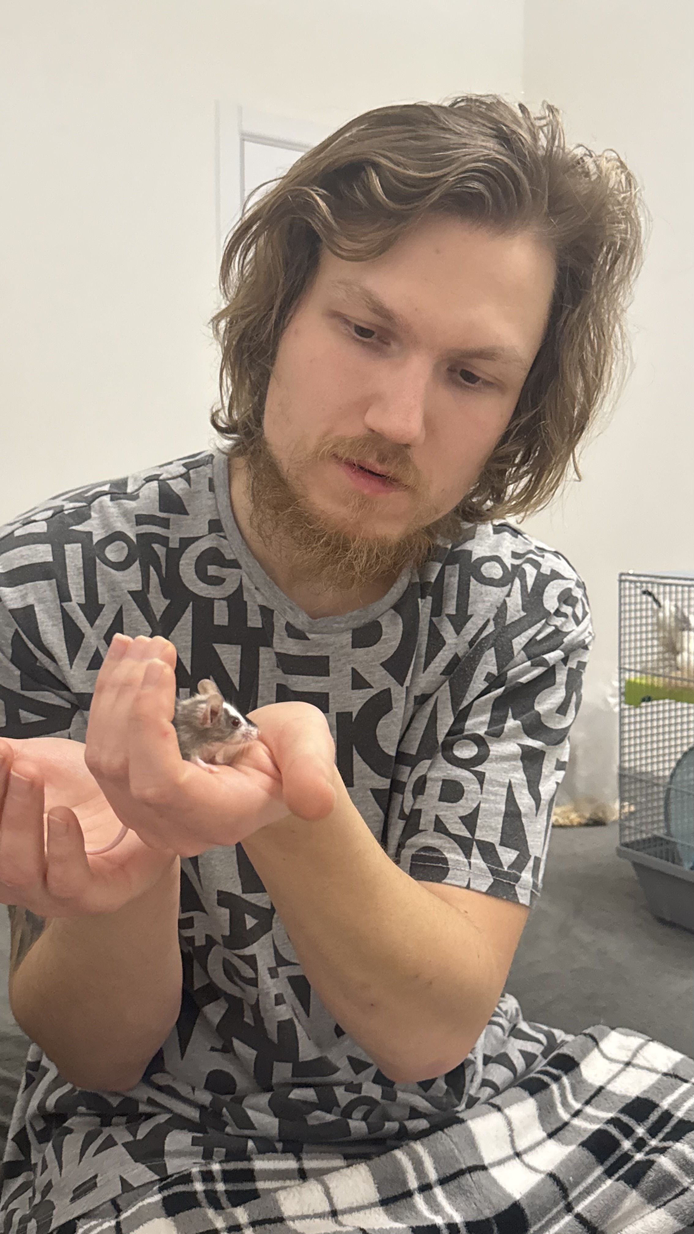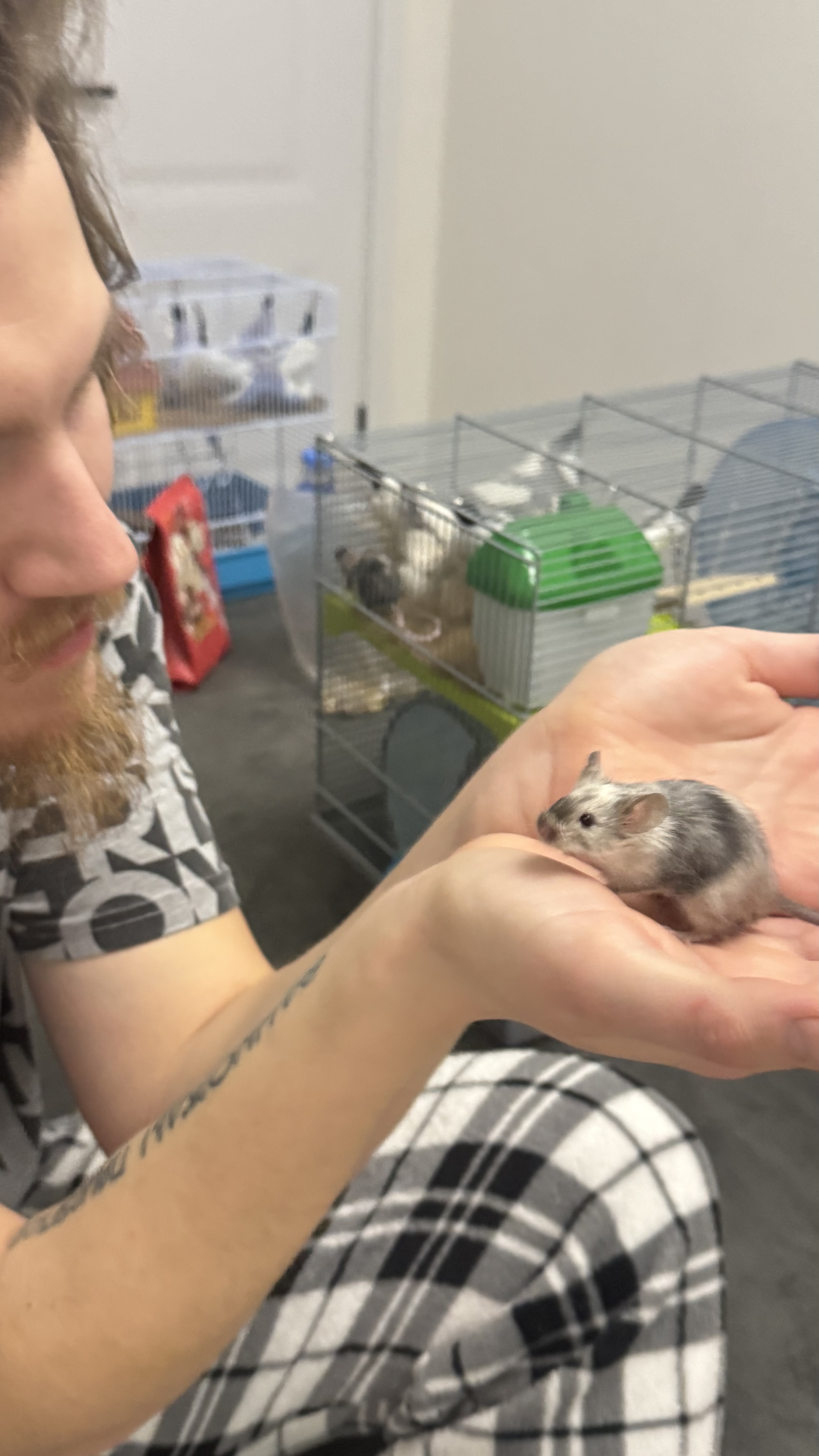 Привез домой, через пару дней стали с женой мышек сселять. Они сразу поладили, через пару дней мы их уже заселили в большую клетку. И утром 30 декабря я увидел, что Нона(так назвали вторую мышку) делает то самое с Арсенией. Рассадили по клеткам. Мальчик. Проверили у знатоков в группе в ВК, да! Повезло, что у самца ещё не развились семенники, он не оплодотворил самку. Рожают они в среднем 5-8 детёнышей обычно, кстати.