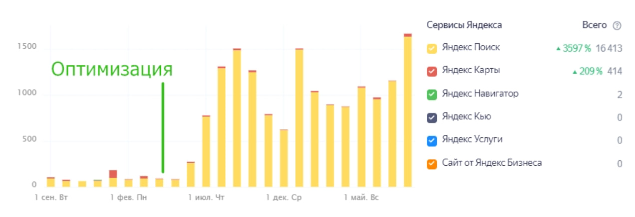 На графике видно, как после оптимизации карточки количество переходов и взаимодействий в Яндекс Картах выросло в несколько раз.
