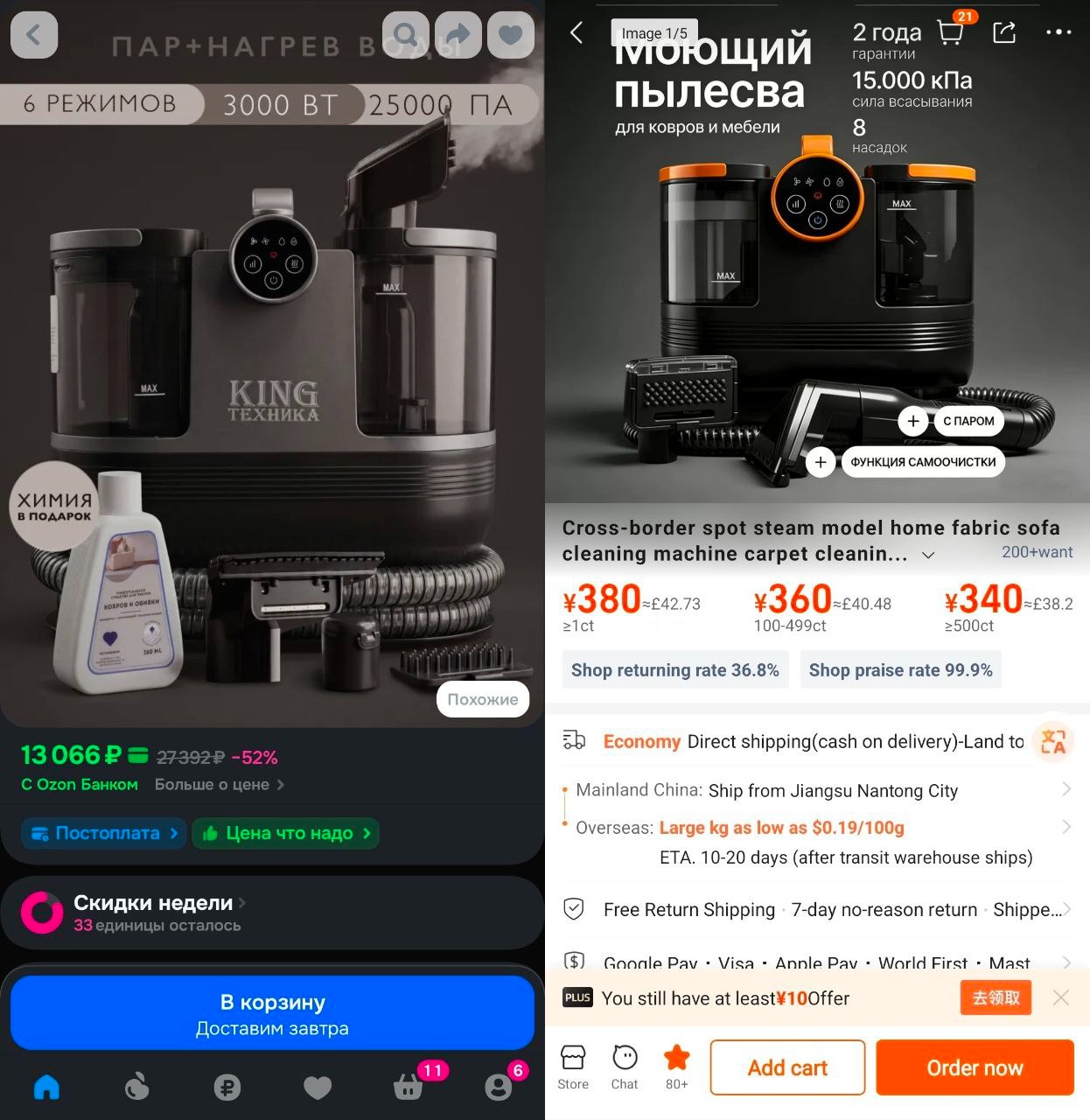 Покажу яркий пример — недавно соседка дала мне попользоваться пылесосом для чистки мебели и я захотела купить его себе. Цены на фото — в России в рублях и в Китае в юанях (даже карточка в Китае частично на русском — это не перевод, это карточка переведена китайцами для русскоговорящих покупателей).