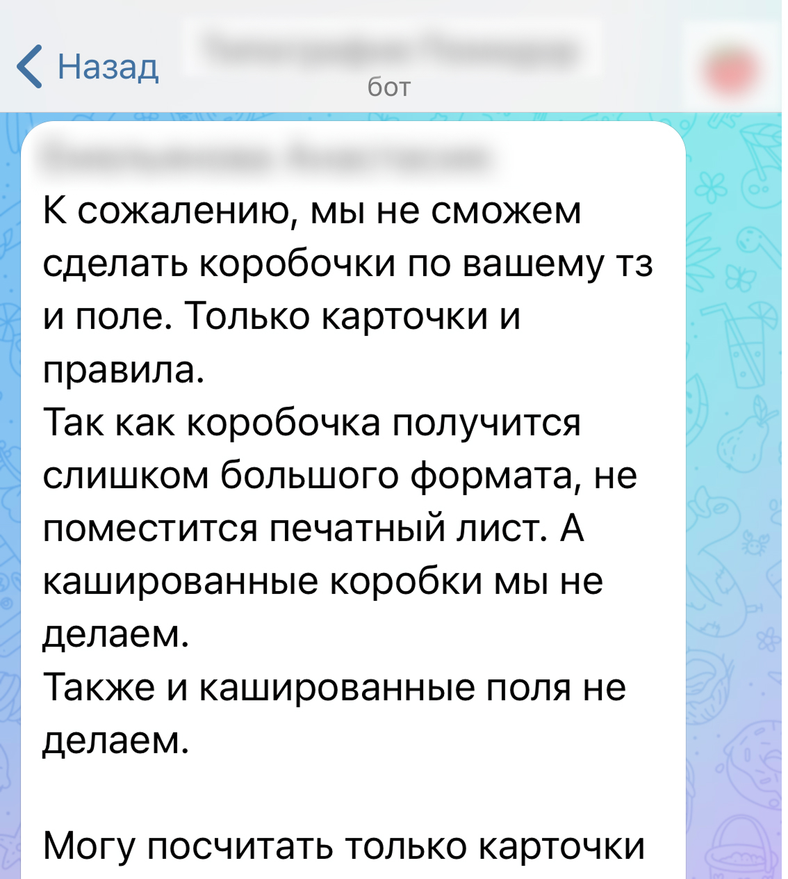 Поэтому в одной типографии мы заказали поле и правила, в другой — карточки, в третьей — развёртку для коробки. Саму коробку купили на маркетплейсе у продавца, который специализируется на товарах для настолок.