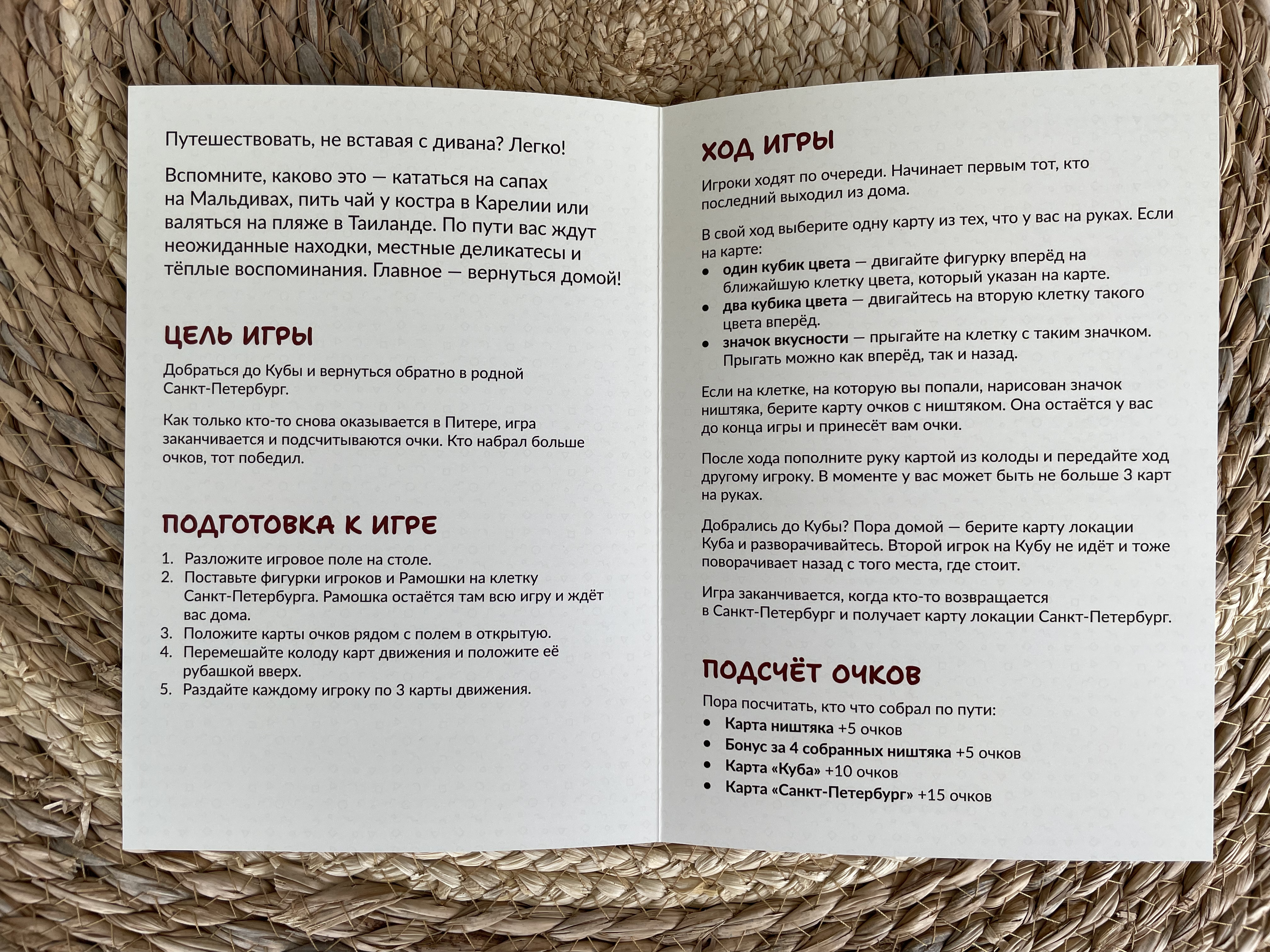 Оставалось самое лёгкое — правила. Написали текст, сверстали и добавили картинок. В правилах прописали и проиллюстрировали даже состав игры, как в настоящих настолках.