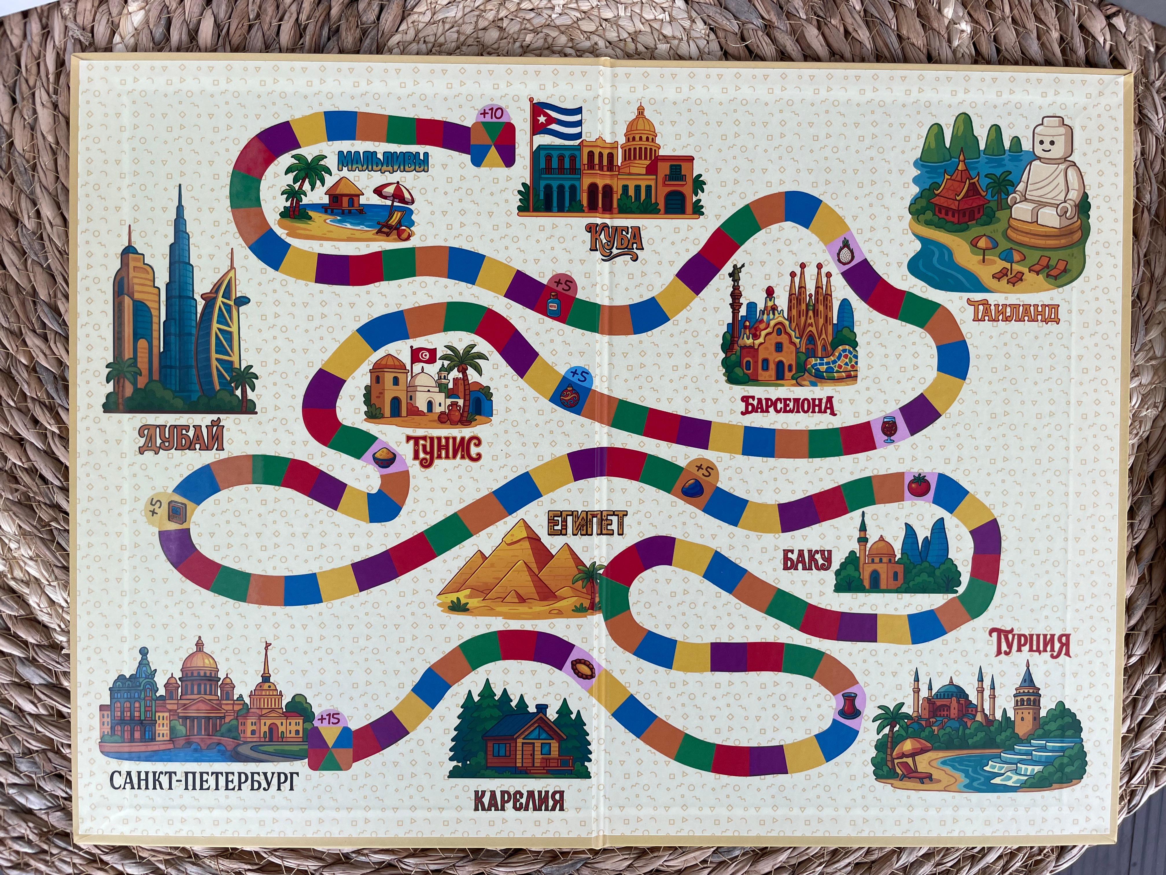 Затем перешли к полю. Решили не усложнять задачу и взяли за основу поле из Candyland, только нужно было его адаптировать. Мы не иллюстраторы, поэтому для отрисовки наших локаций на карте использовали нейросеть. Это заняло много времени, но того стоило — работа с художником-иллюстратором была бы дороже и дольше. Локации расположили на поле в зависимости от удалённости от Петербурга.