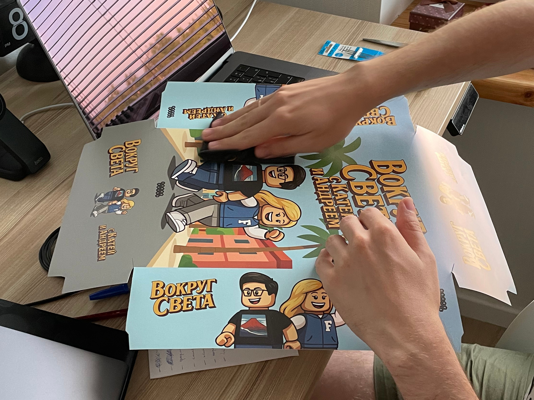 Оставалось собрать всё вместе. Мы наклеили развёртку на коробку — это было непросто, но муж всё сделал идеально.
