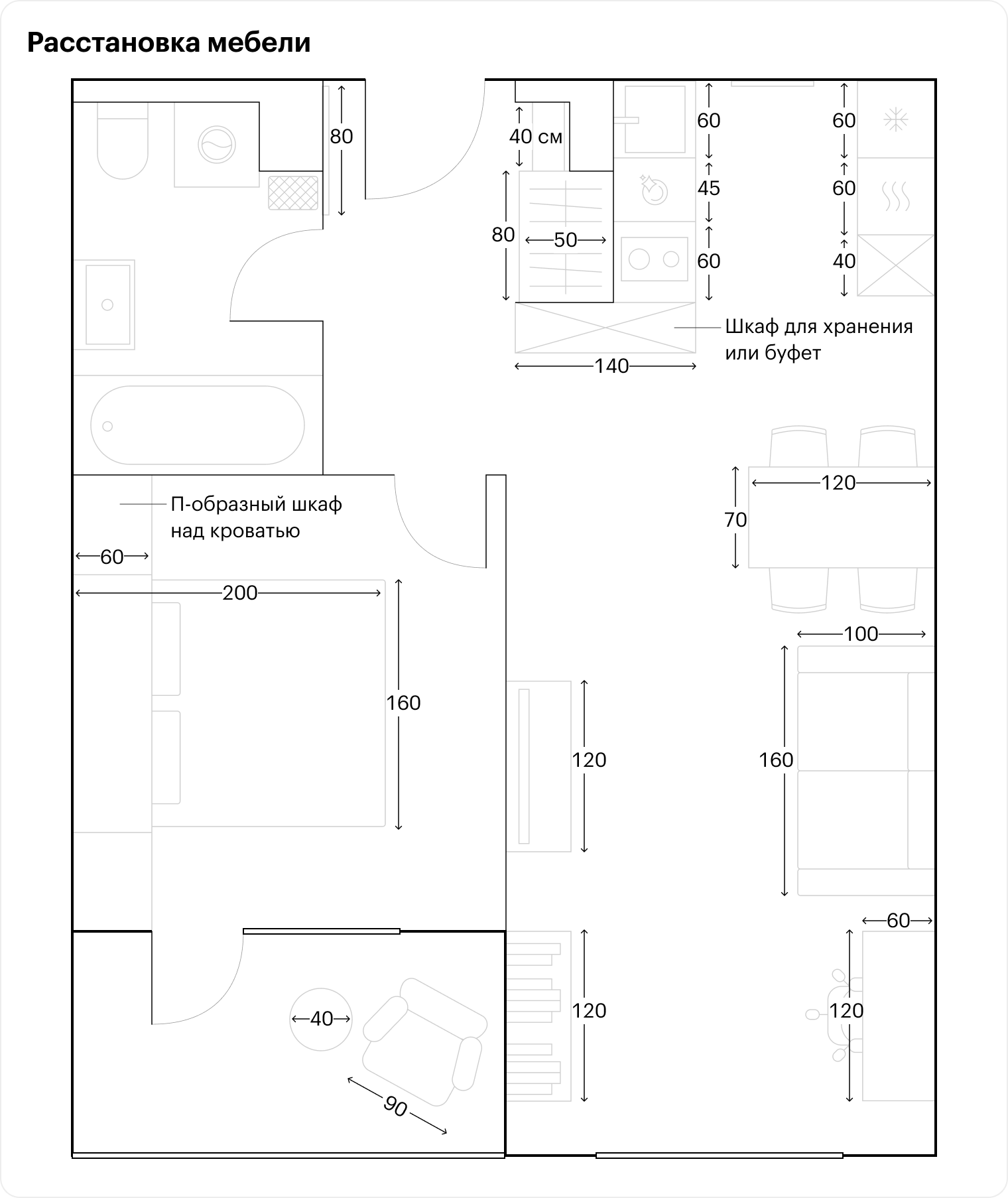 Спальня. Очень коварная комната в вашем случае: хочется поставить шкаф около двери и двуспальную кровать, но если так сделать, никаких проходов между шкафом и кроватью, а также между кроватью и окном не останется. Поэтому делаем П-образный шкаф над кроватью, а саму кровать обязательно покупаем с подъемным механизмом, чтобы было куда складывать вещи.