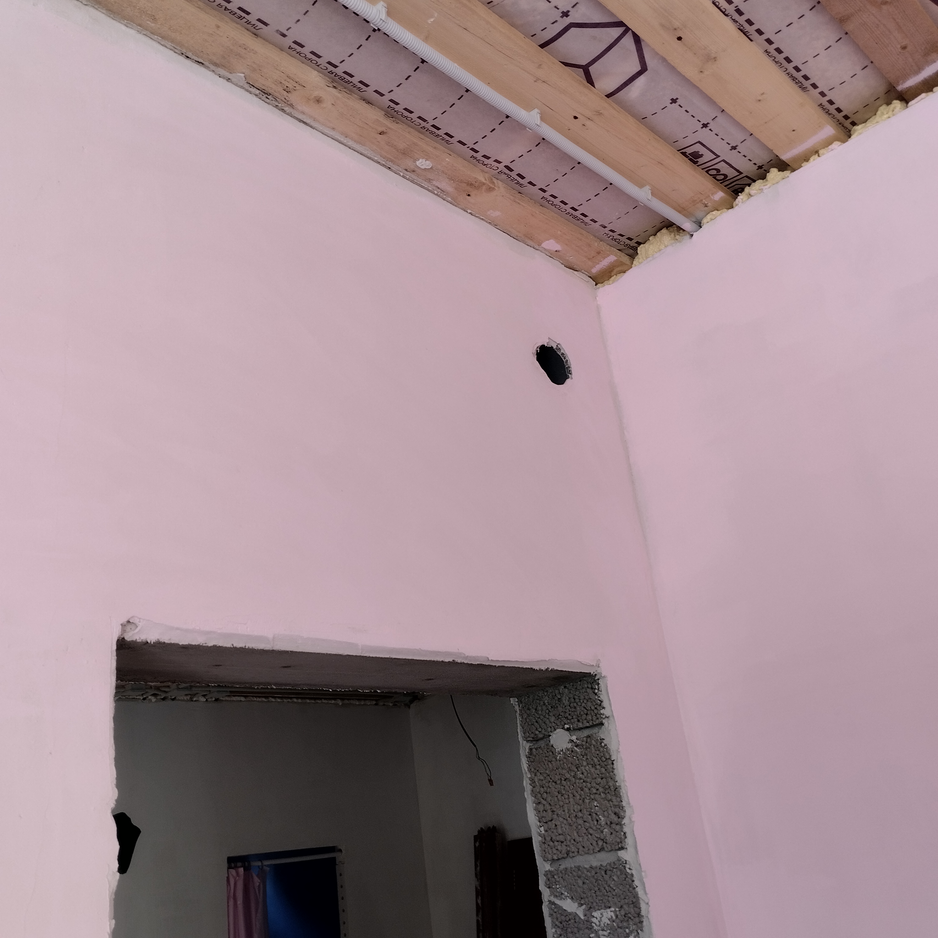 Ну и пароизоляция на потолке нигде не приклеена, поэтому там, где потолок примыкает к наружным стенам дома, тоже зоны холода. А ещё строитель не обработал доски чернового потолка и балки огнебиозащитой, и часть досок уже черная от плесени. Готовимся теперь летом переделывать потолок: менять пароизоляция, проводить обработку досок и балок, вставлять клапаны в вентиляцию и перекрывать лишние отличные каналы из комнат.