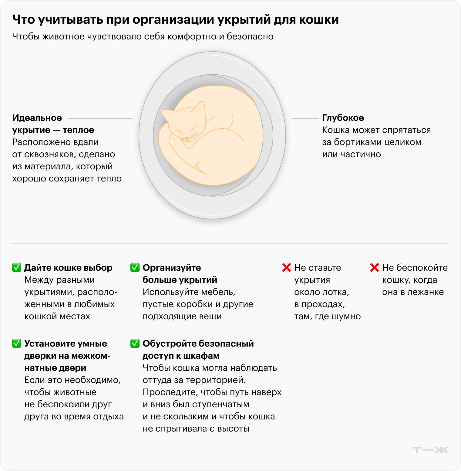 Мест для отдыха должно быть как минимум на одно больше, чем кошек. Важно, чтобы укрытия были безопасными с кошачьей точки зрения — стояли на возвышении, а также чтобы кошка могла спрятаться в них частично или полностью.