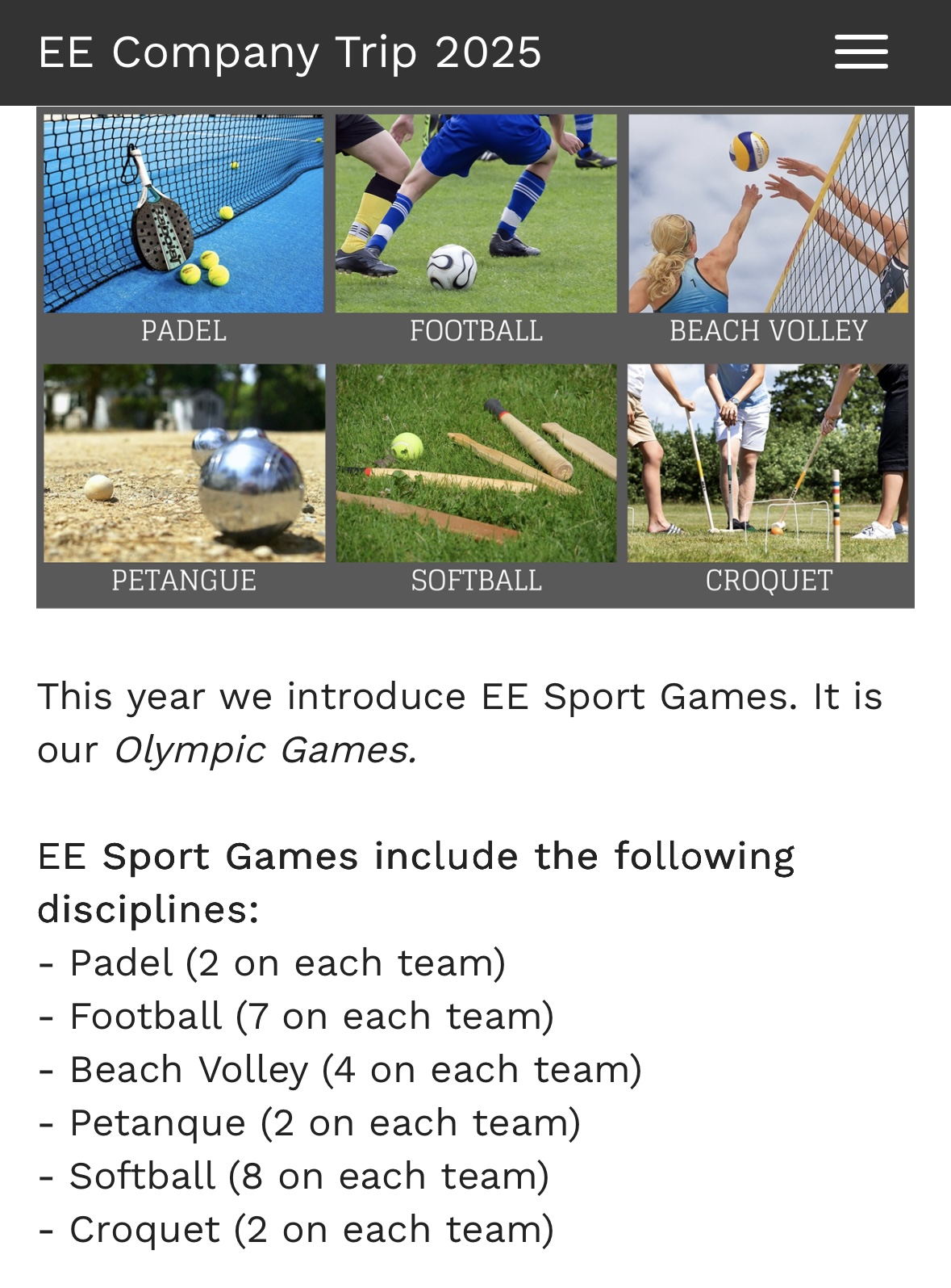 Сегодня день спортивных активностей и командных соревнований, на которые нужно было записываться заранее в приложении. Вот две фотки из приложения с иллюстрацией списка преложенных активностей.