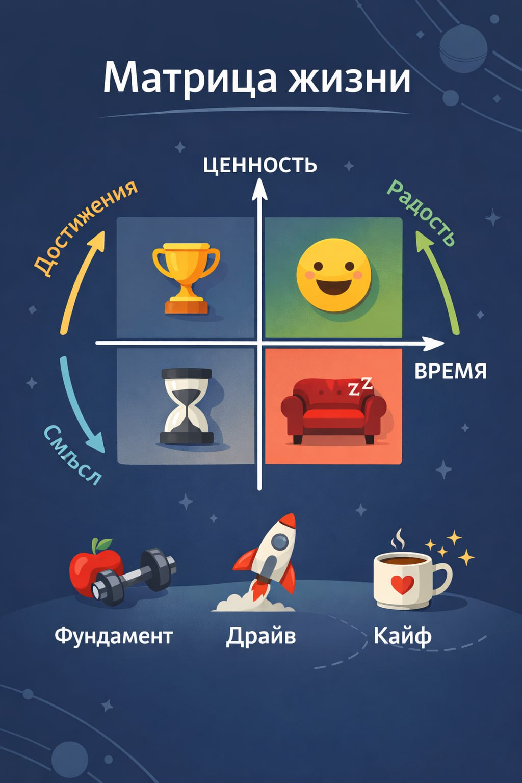 Такие инструменты, как «матрица жизни», полезны не тем, что дают готовые ответы. Они просто делают видимой картину: куда уходит время и что из этого действительно важно.