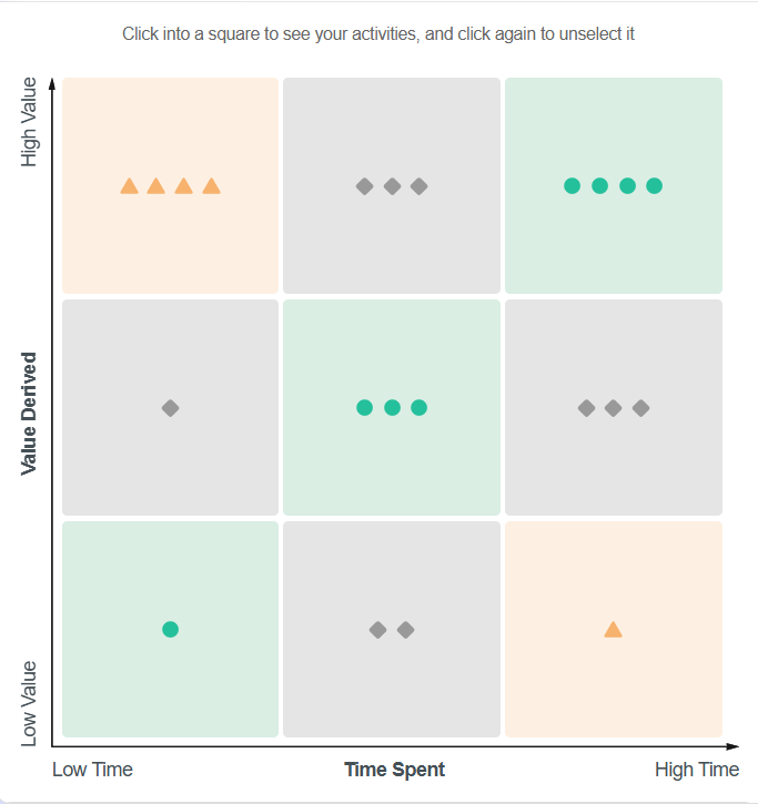 При нажатии на разные символы в матрице можно увидеть, где именно находятся ваши активности на шкале «время — ценность» и как распределяются ваши реальные приоритеты.