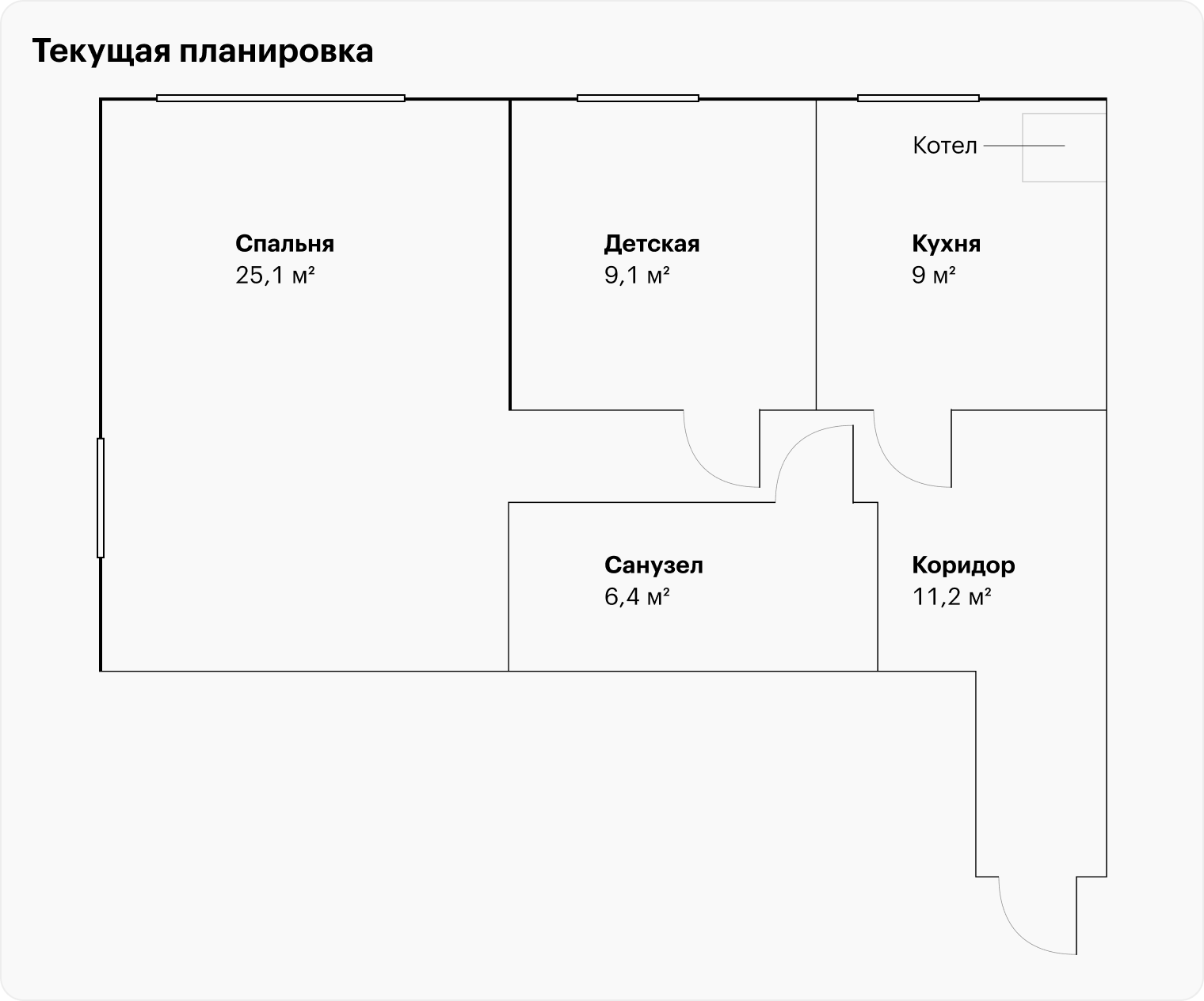 Еще из нюансов: на кухне висит газовый котел, перемещать его можно, но только по той же стене. Несущая стена только в спальне.