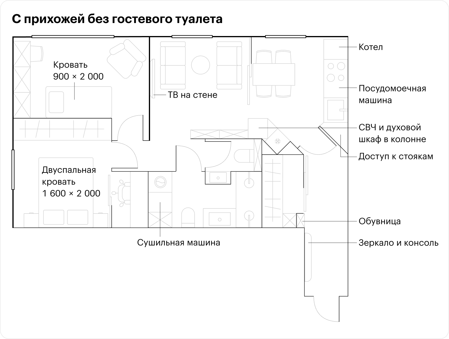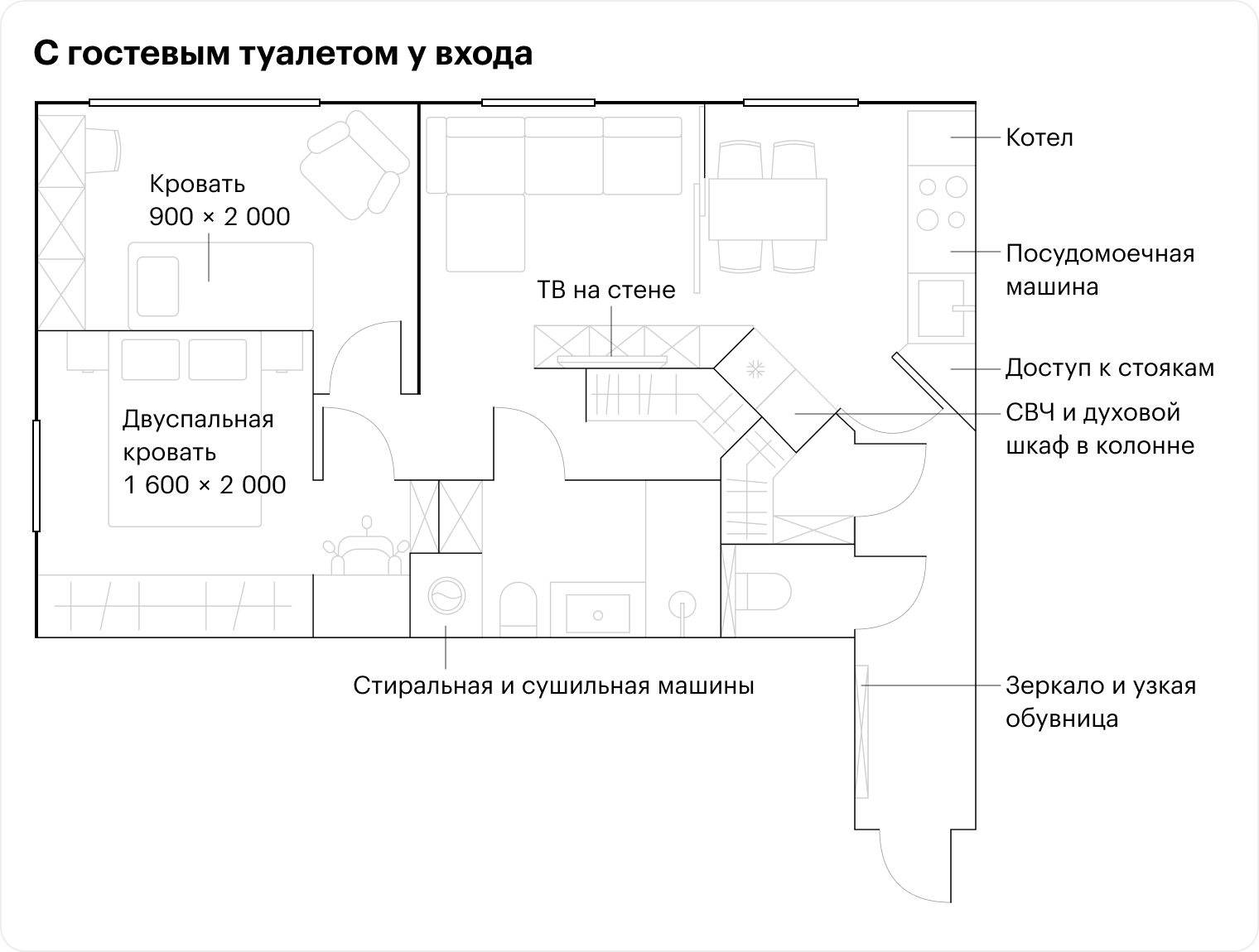 В этом варианте выделяем уборную у входа. Это удобно для разграничения приватной и публичной зон квартиры. Очень актуально с маленькими детьми. Ширина помещения должна быть минимум 900 мм, глубина — около 1 500 мм. В уборной делаем полочки для хранения туалетной бумаги, бытовой химии и скрытый доступ к стоякам. Можно дополнить помещение микромойкой для рук.
