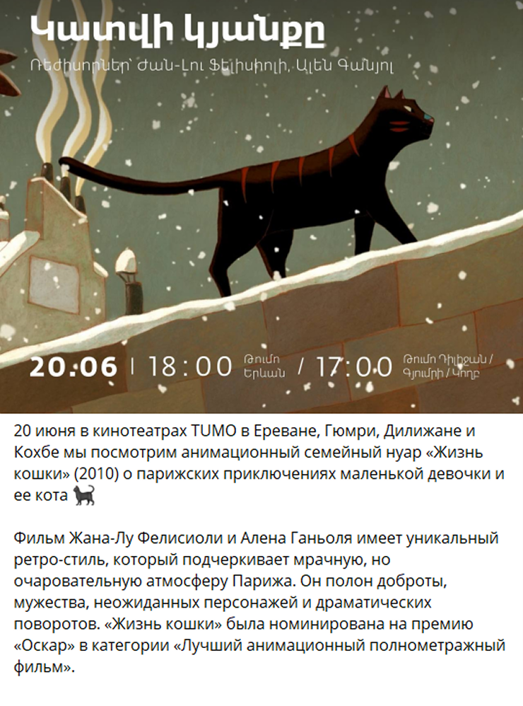 В Ереване, Гюмри, Дилижане и некоторых других городах есть филиалы образовательного центра TUMO. Подростки изучают технологии, искусство, науку и музыку по современным методикам. Иногда здесь проводят открытые показы авторских мультфильмов и кино. Мы с ребенком с удовольствием посещаем такие мероприятия. Обучение и все активности бесплатны, правда, занятия только на армянском языке.
