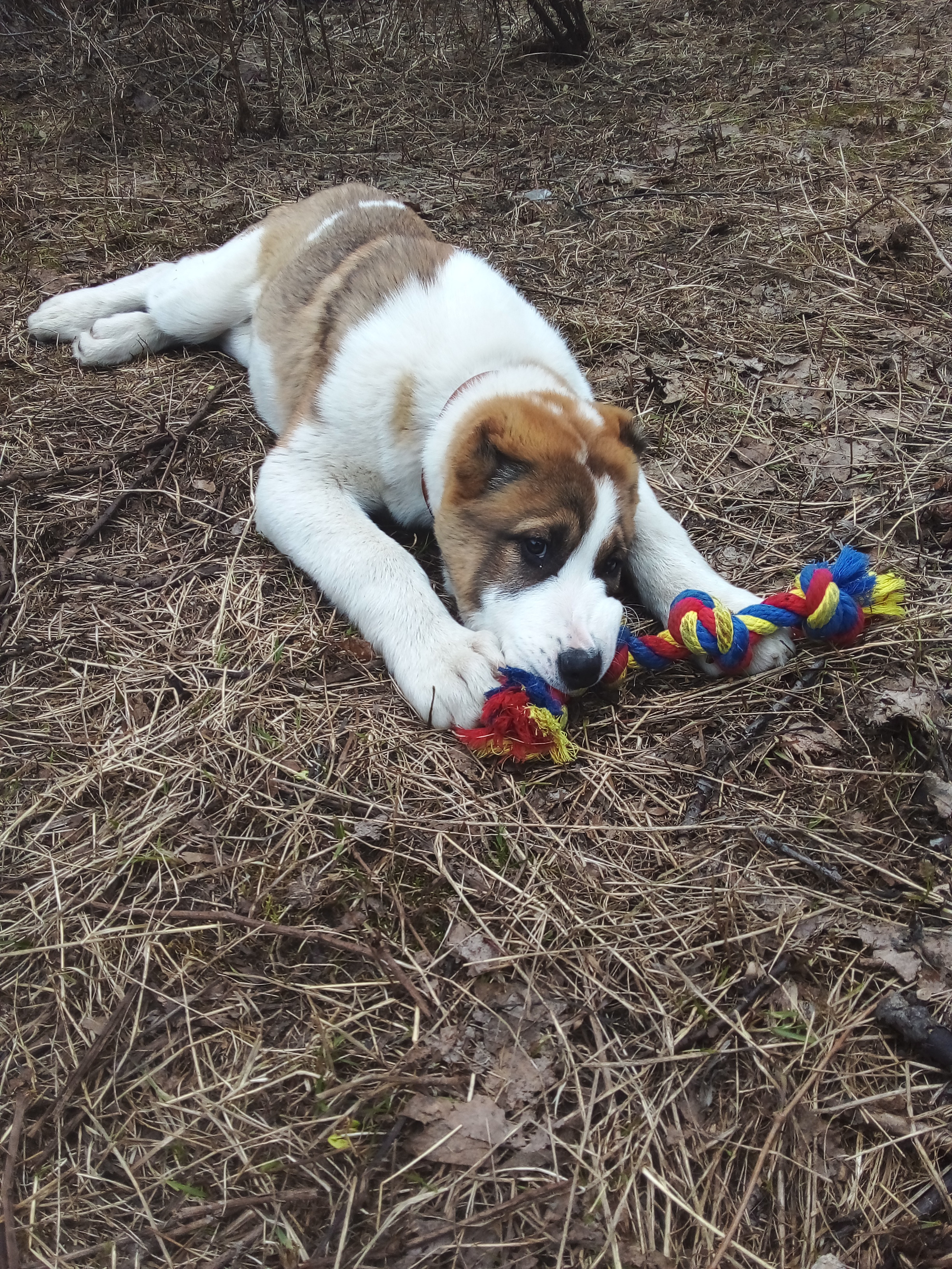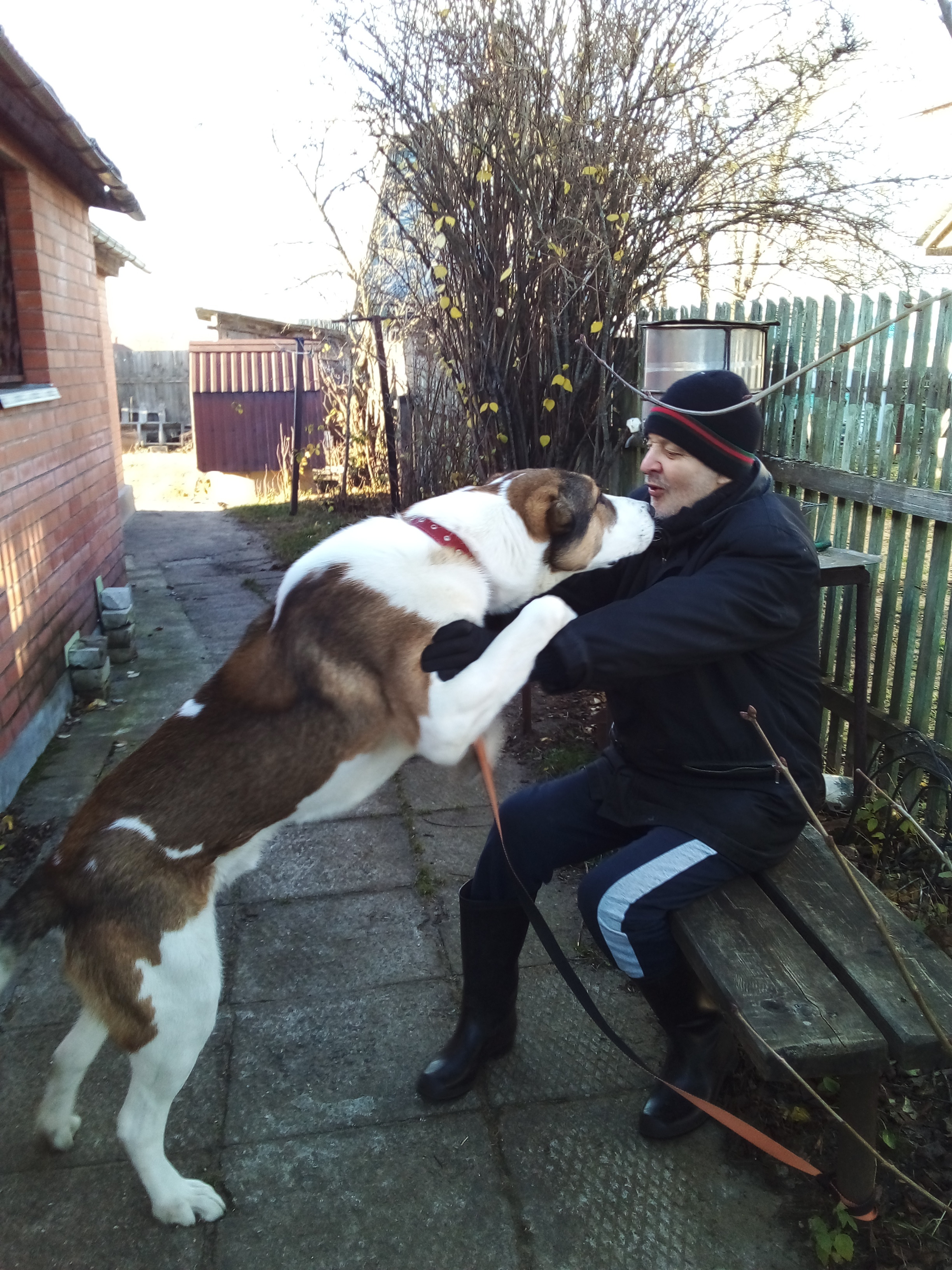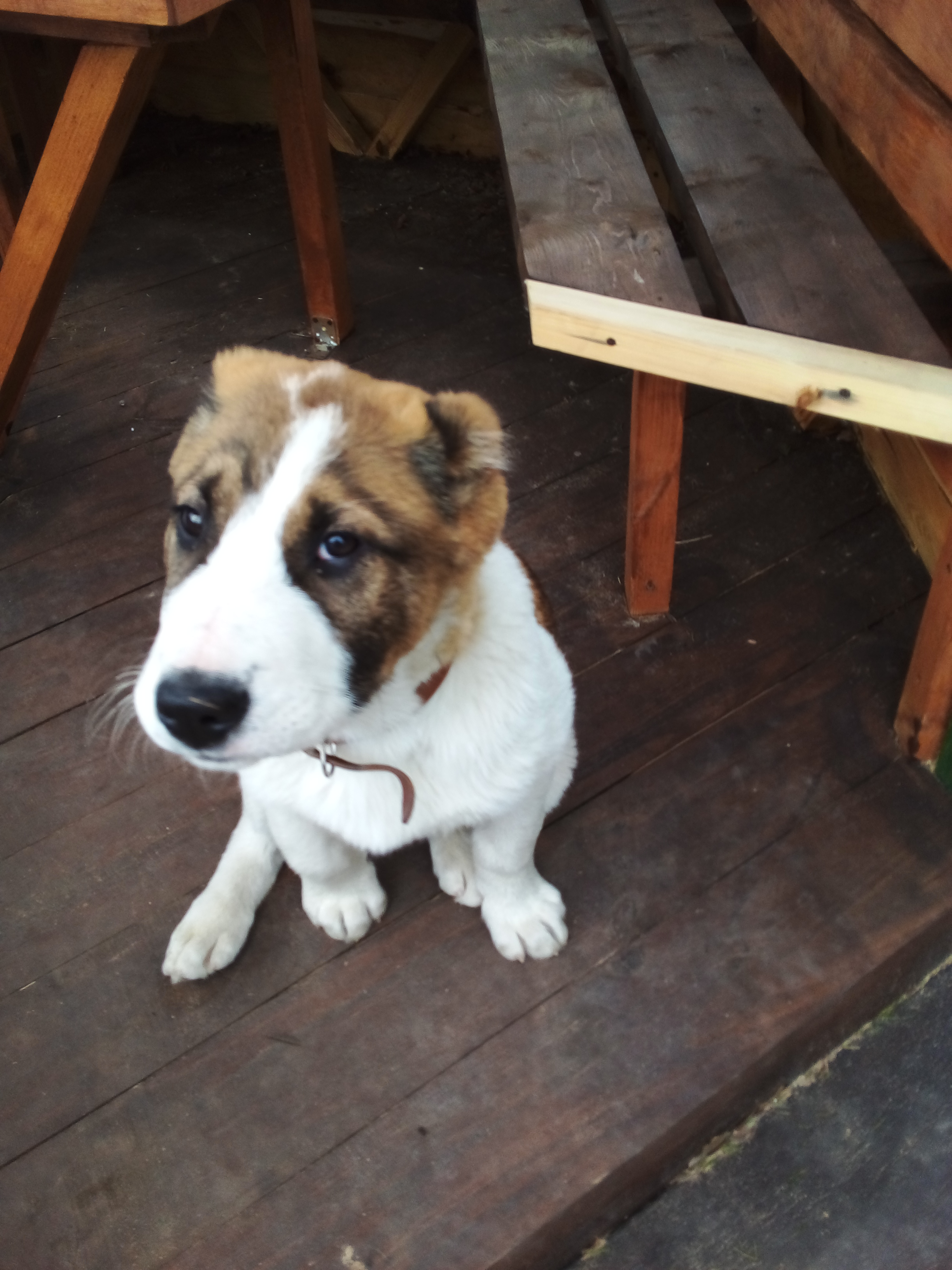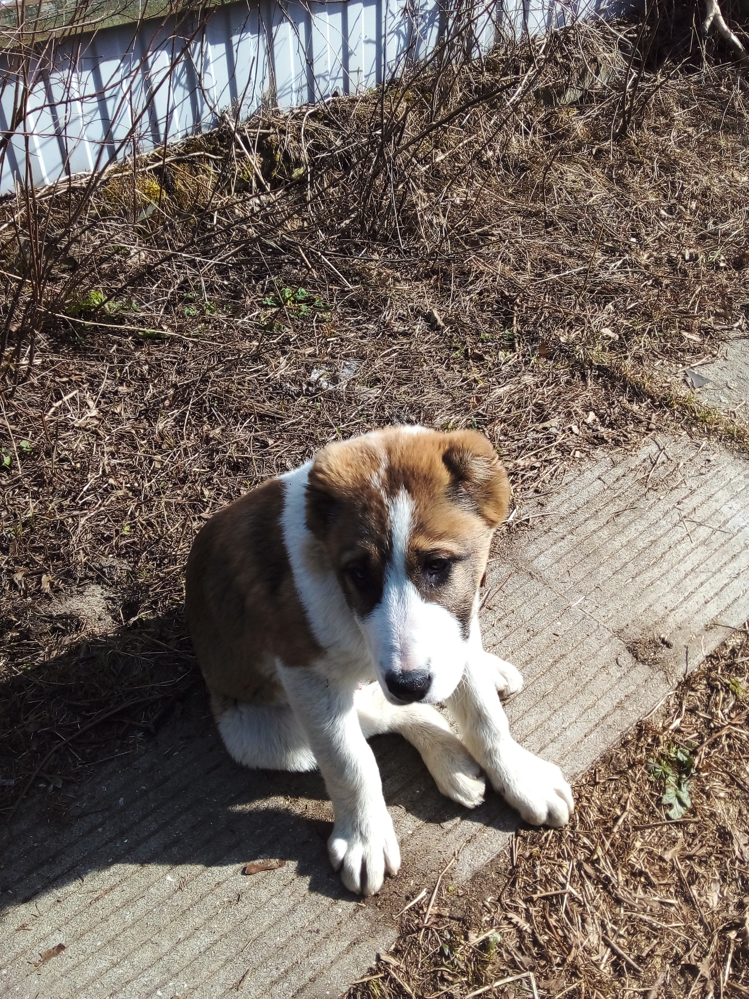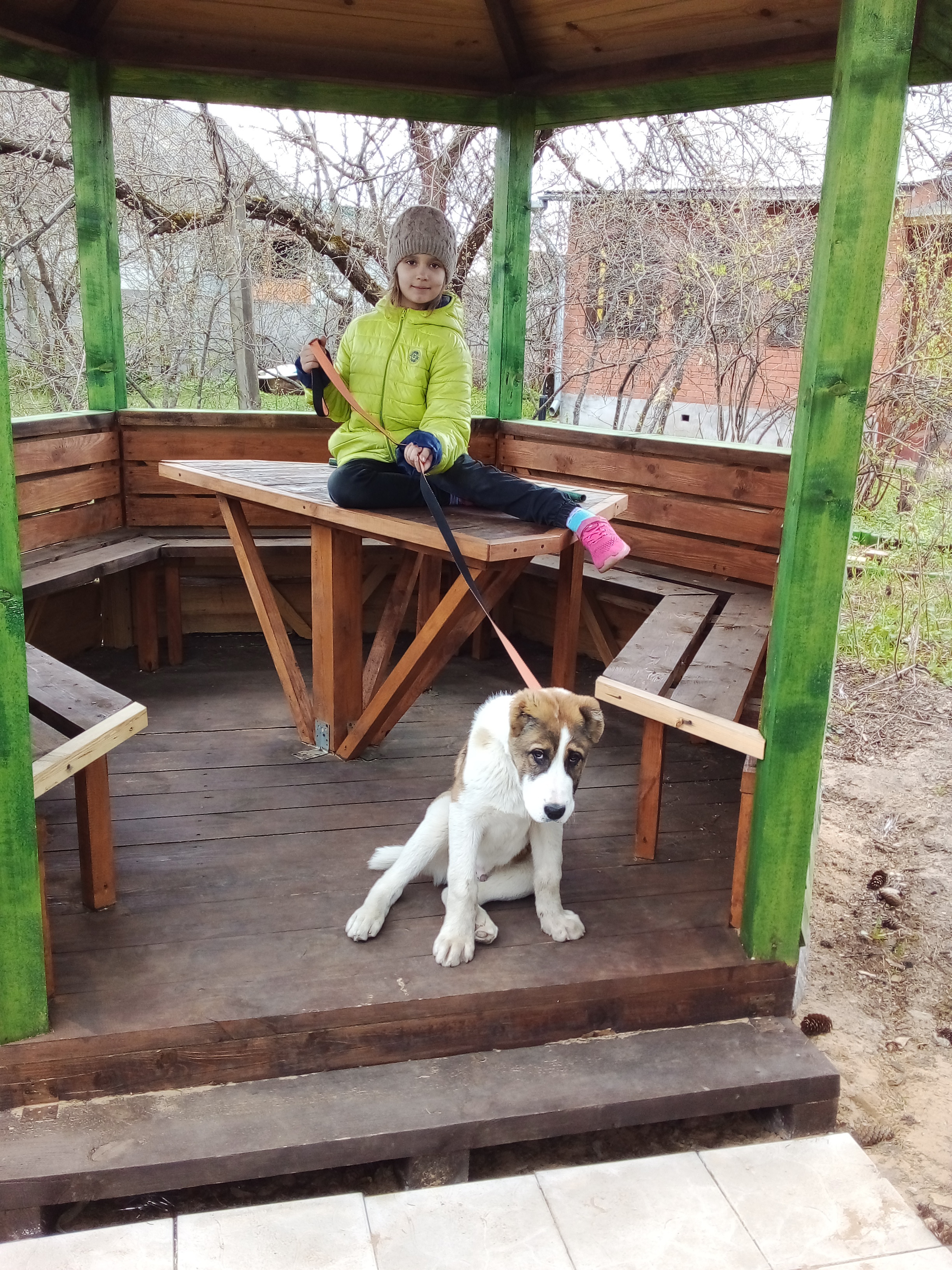 Привезли в начале апреля. Малявочка 3.5 месяца. Сразу принял свой новый домик и вольер,который остался ему в наследство от предыдущих питомцев.Собаки уличного содержания в доме никогда не были. И вот из этой фитюльки вырос огромный любящий друг надежный охранник. А Котики на него в окно смотрели, как на пришельца.Подружились только, когда подрос и до окна дотянулся.