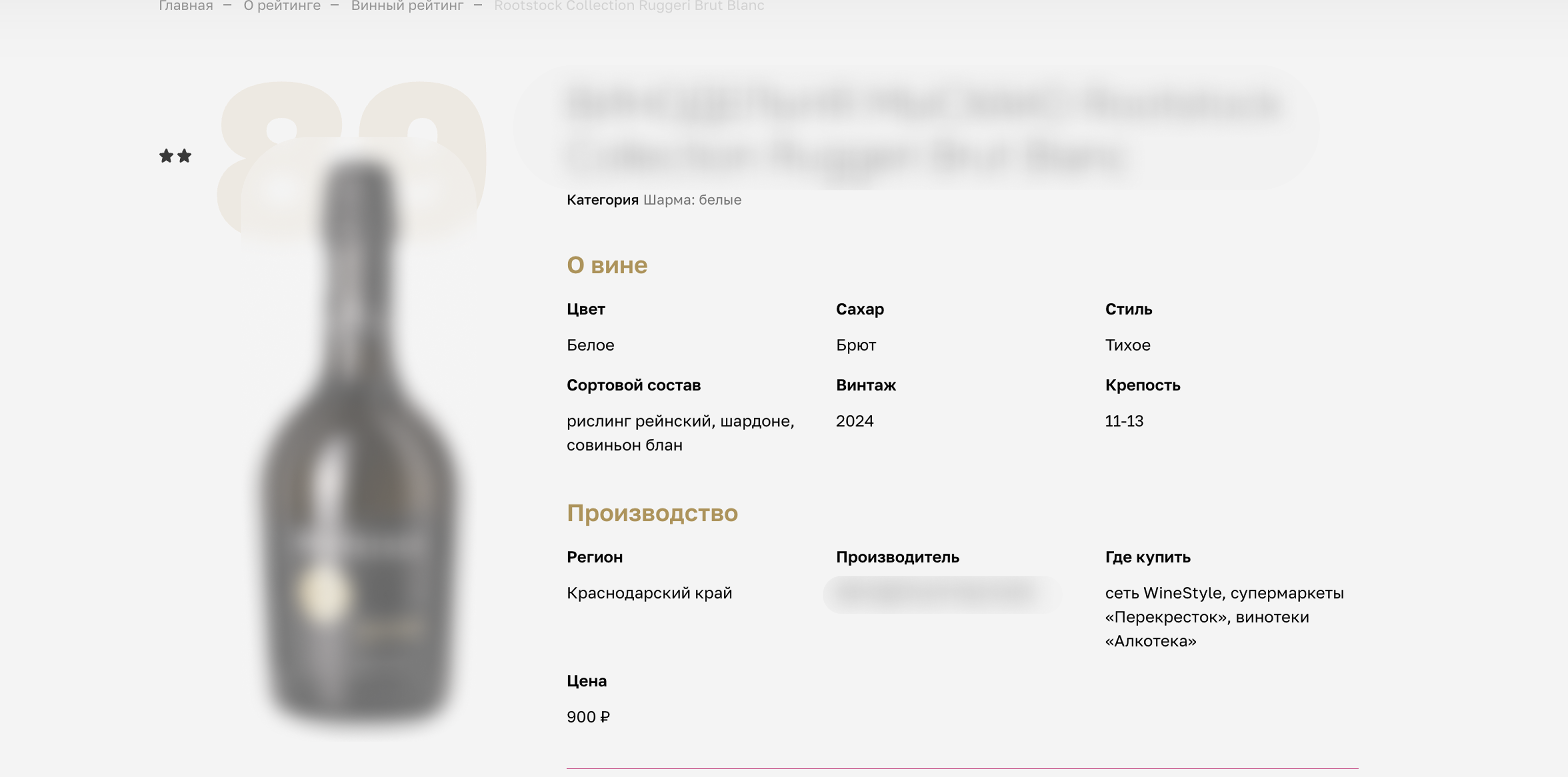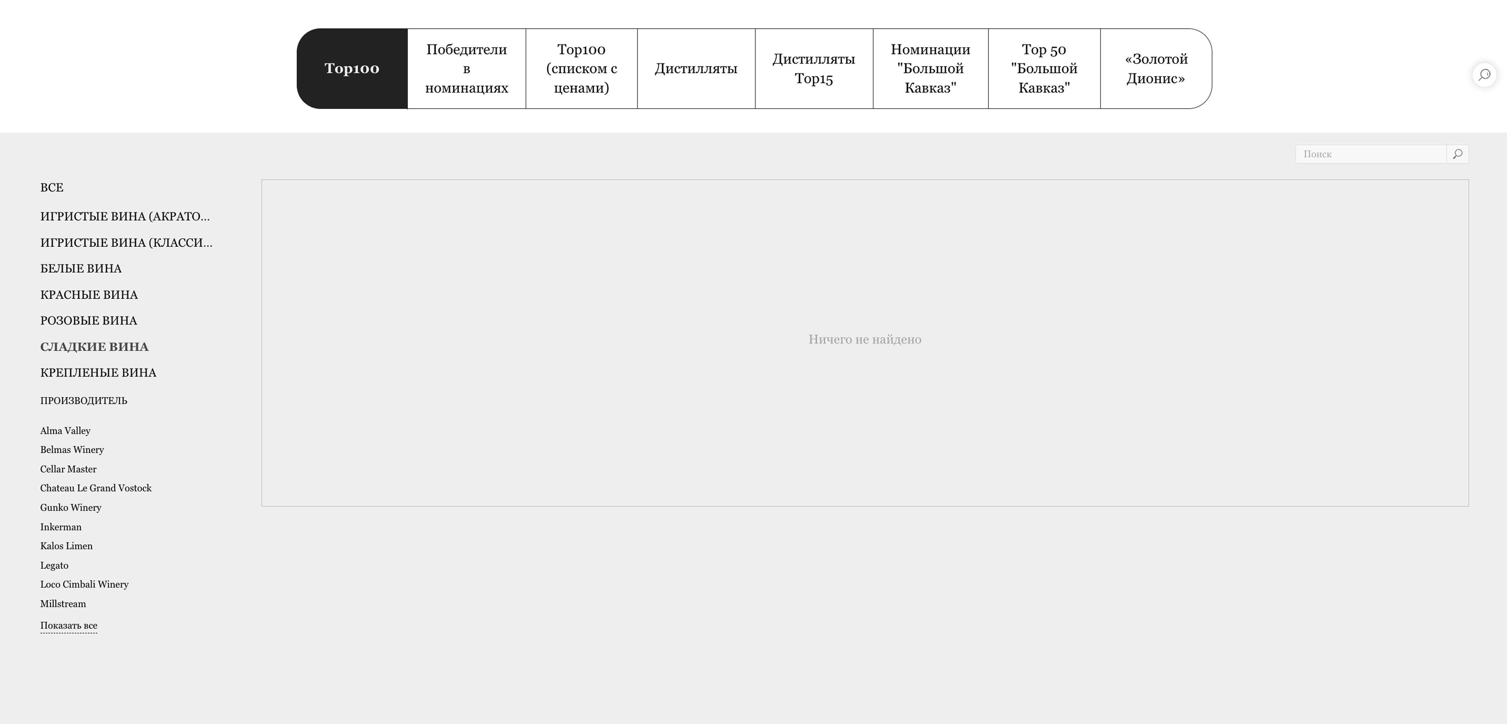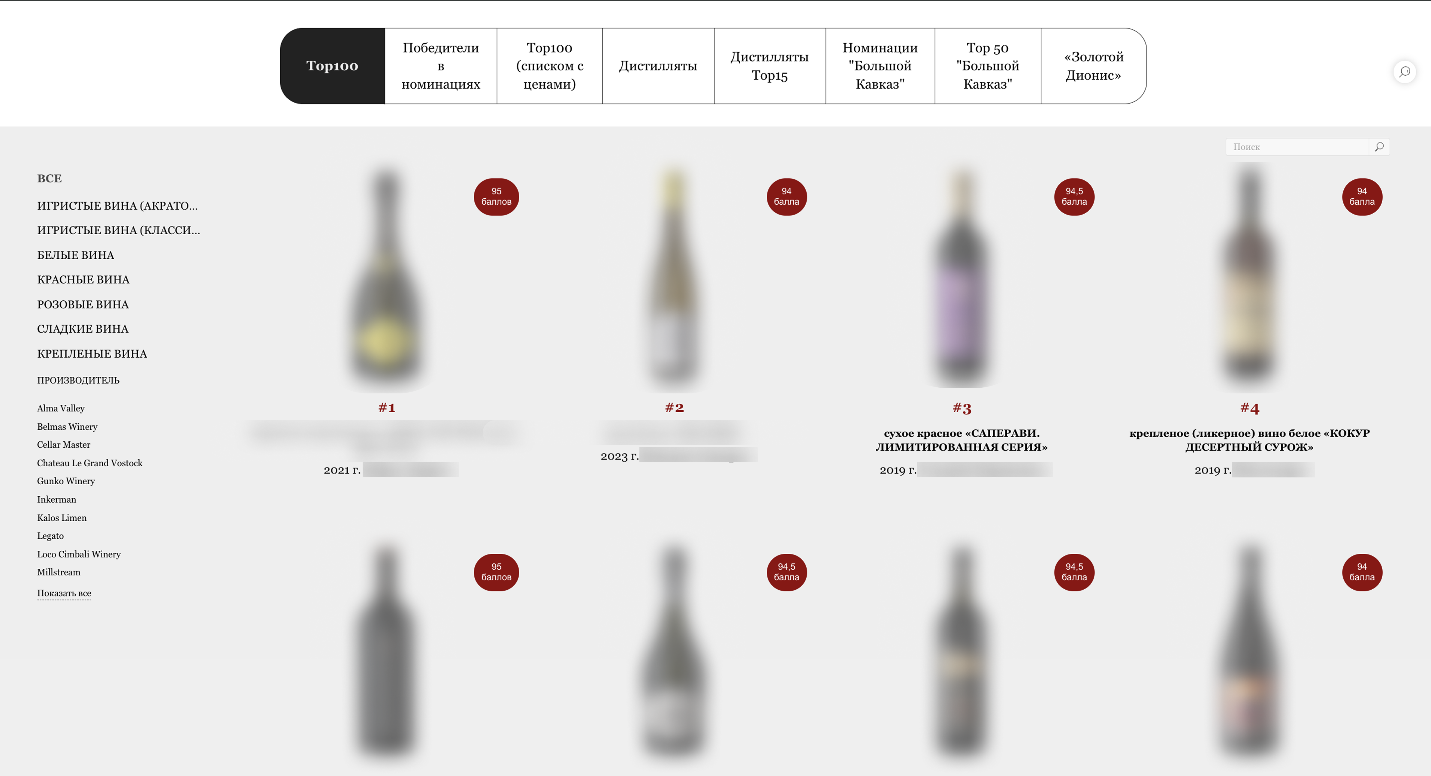 Из минусов — нет дегустационных заметок, нет рекомендаций, с какой едой сочетать. Цены указаны в отдельной вкладке Top-100 списком с ценами.