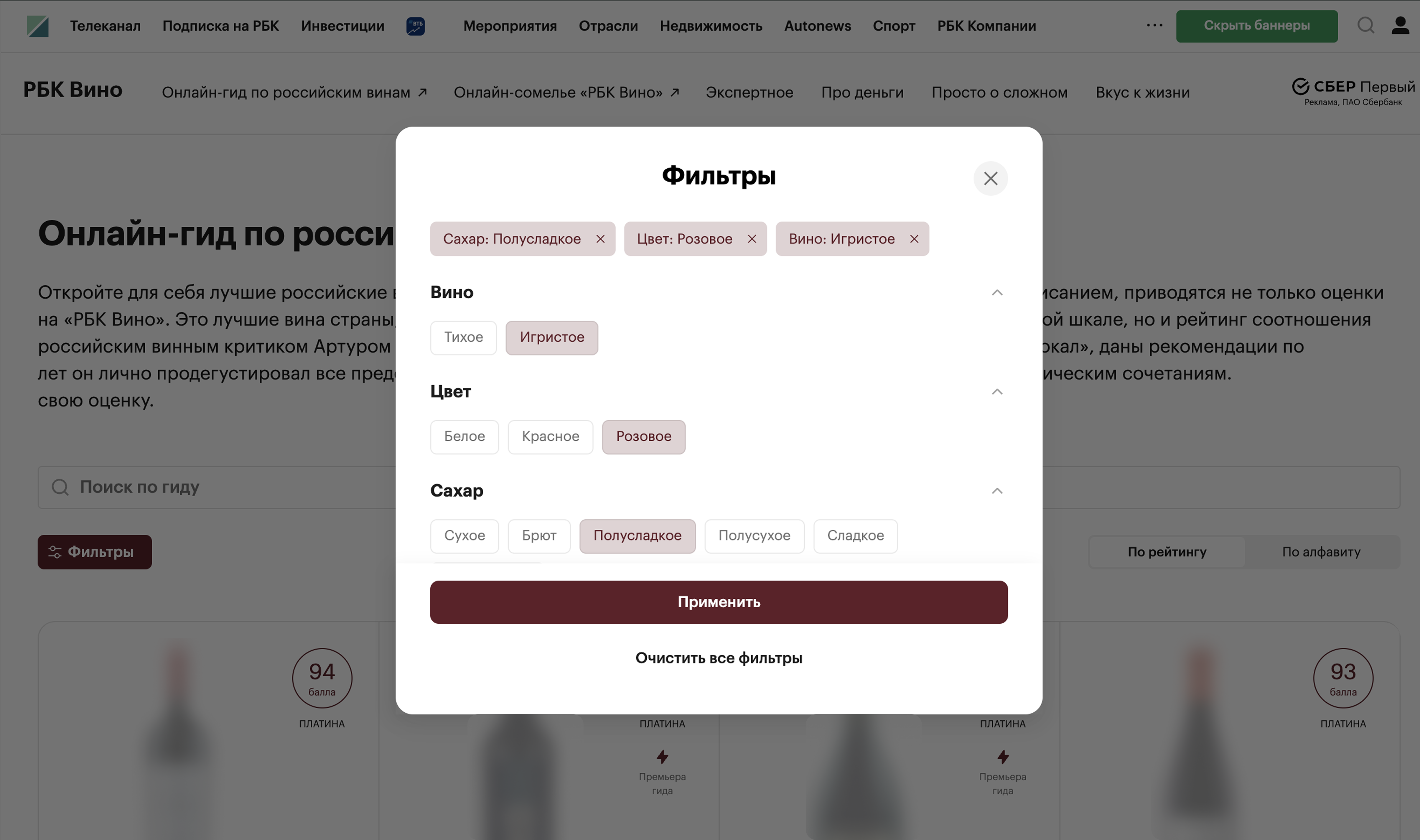 На сайте все вина расположены в хаотичном порядке — и тихие, и игристые. Но есть фильтры: можно отсортировать вина по сахару, году, цвету, сорту и т.д.