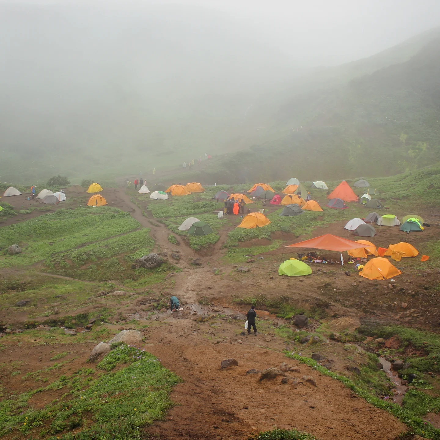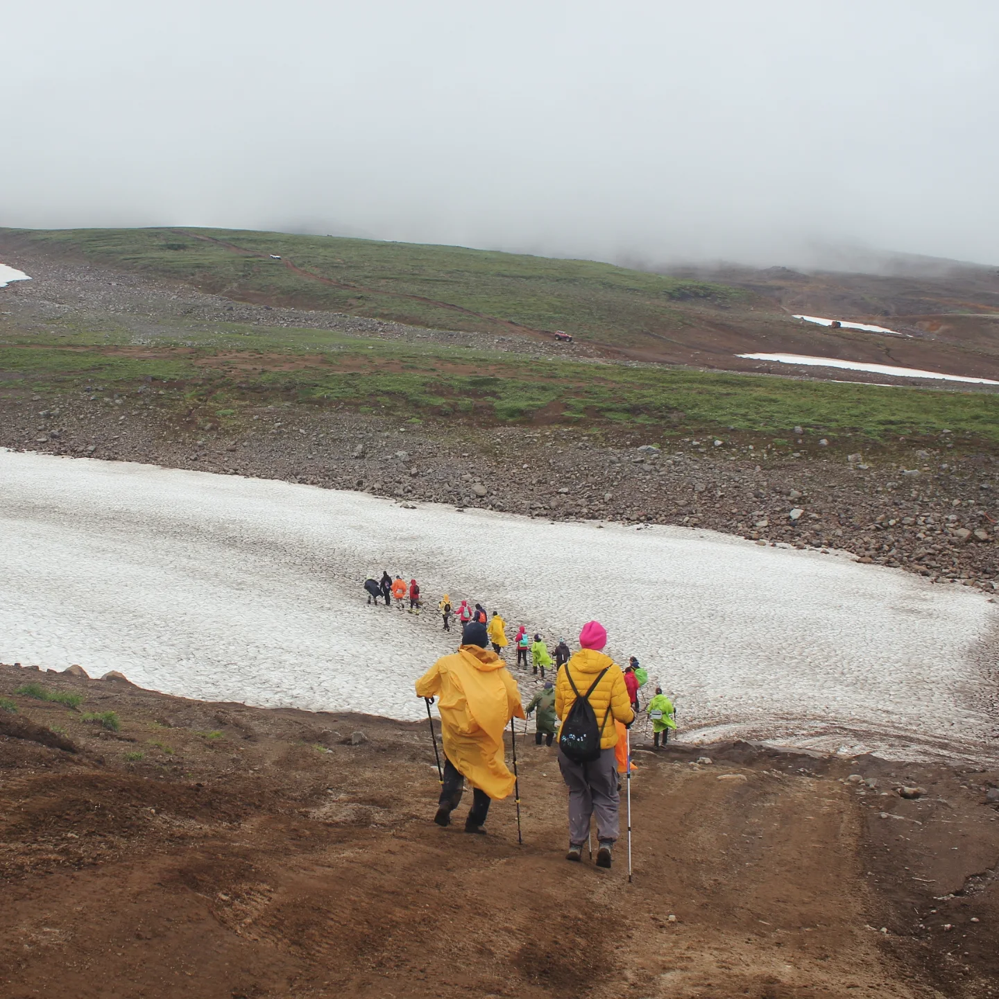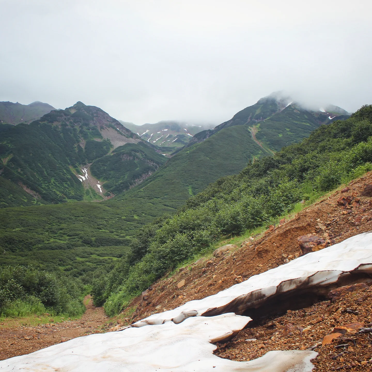 На следующий день был длинный переход к Дачным горячим источникам и Малой долине гейзеров. Я шла на морально-волевых и думала, зачем это всё мне сдалось, потому что вокруг не было видно ничего, кроме тумана, под ногами хлюпала грязь, непромокаемые ботинки медленно промокали, на голову непрерывно лился дождь, а еще мимо периодически проезжали джипы с чистыми сухими туристами. Иногда даже притормаживали, наверное, потешались над чудиками. Но ничего — в конце ждала награда в виде тех самых источников и оазиса буйной ярко-зеленой растительности. После целого дня черно-белой депрессии это была настоящая услада для глаз и души. Источники же были не особо благоустроенными: там не было переодевалок и они подванивали. Однако самое главное — вода была реально горячей, градусов 45. Так что я отмокала, как бегемот Мото-Мото, и радовалась жизни.