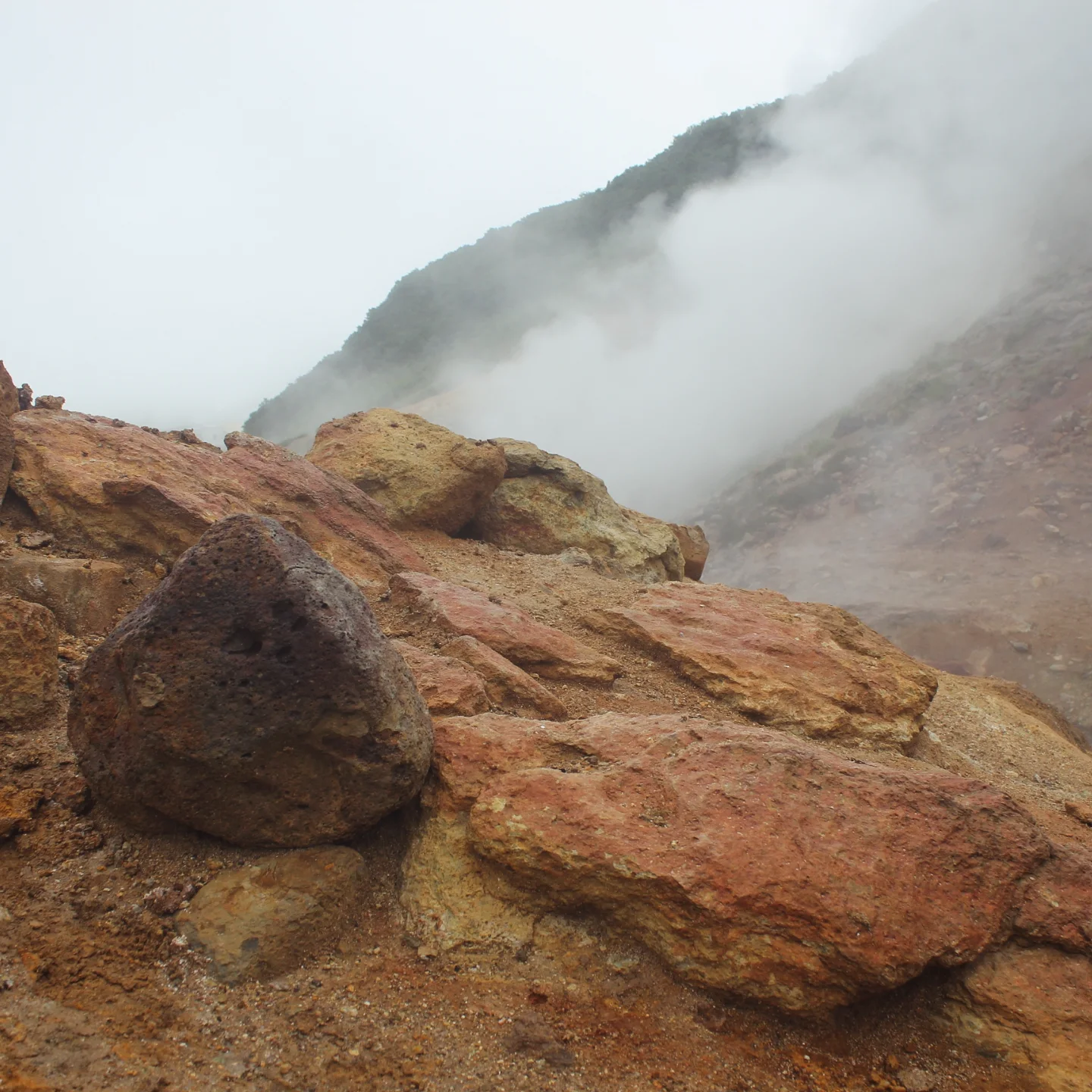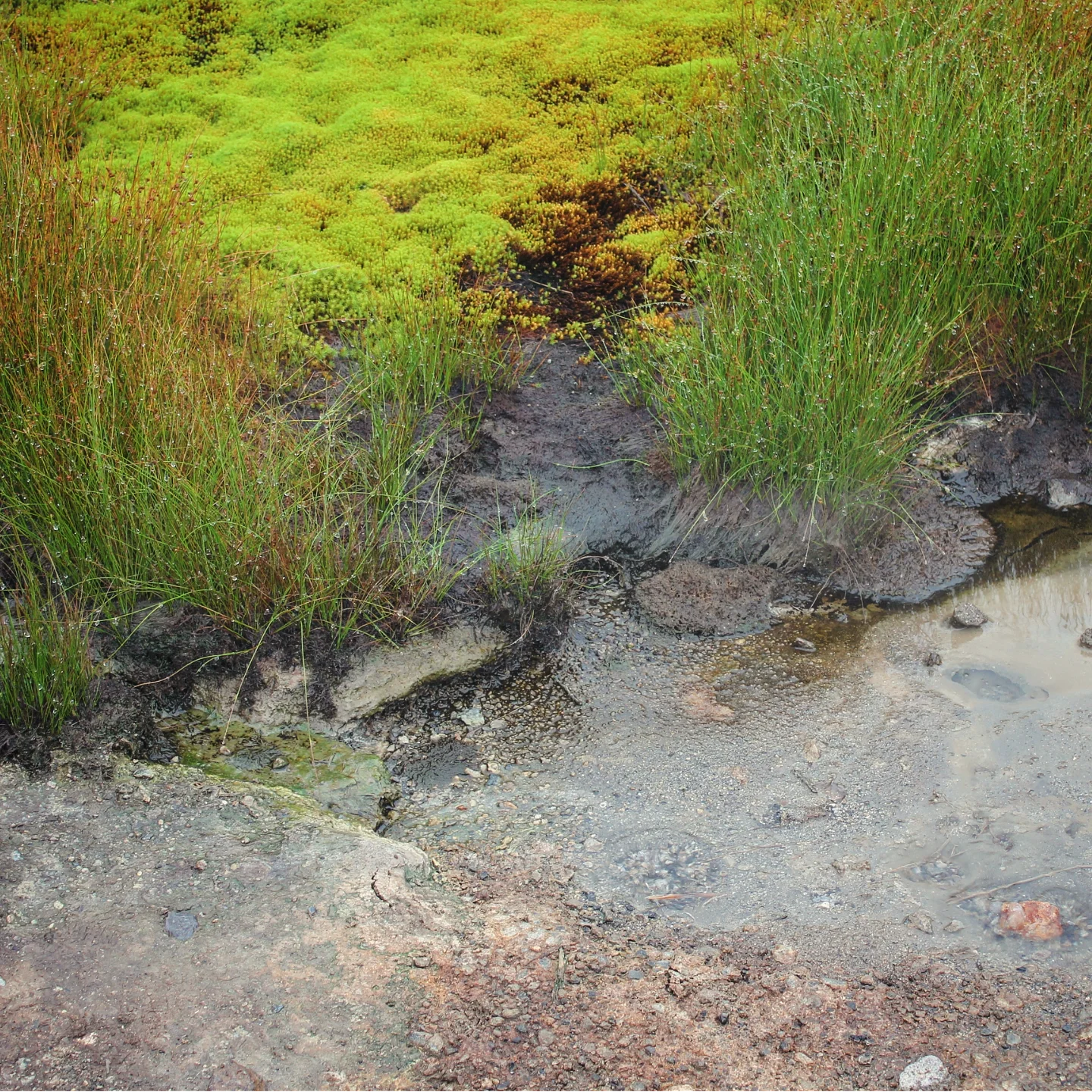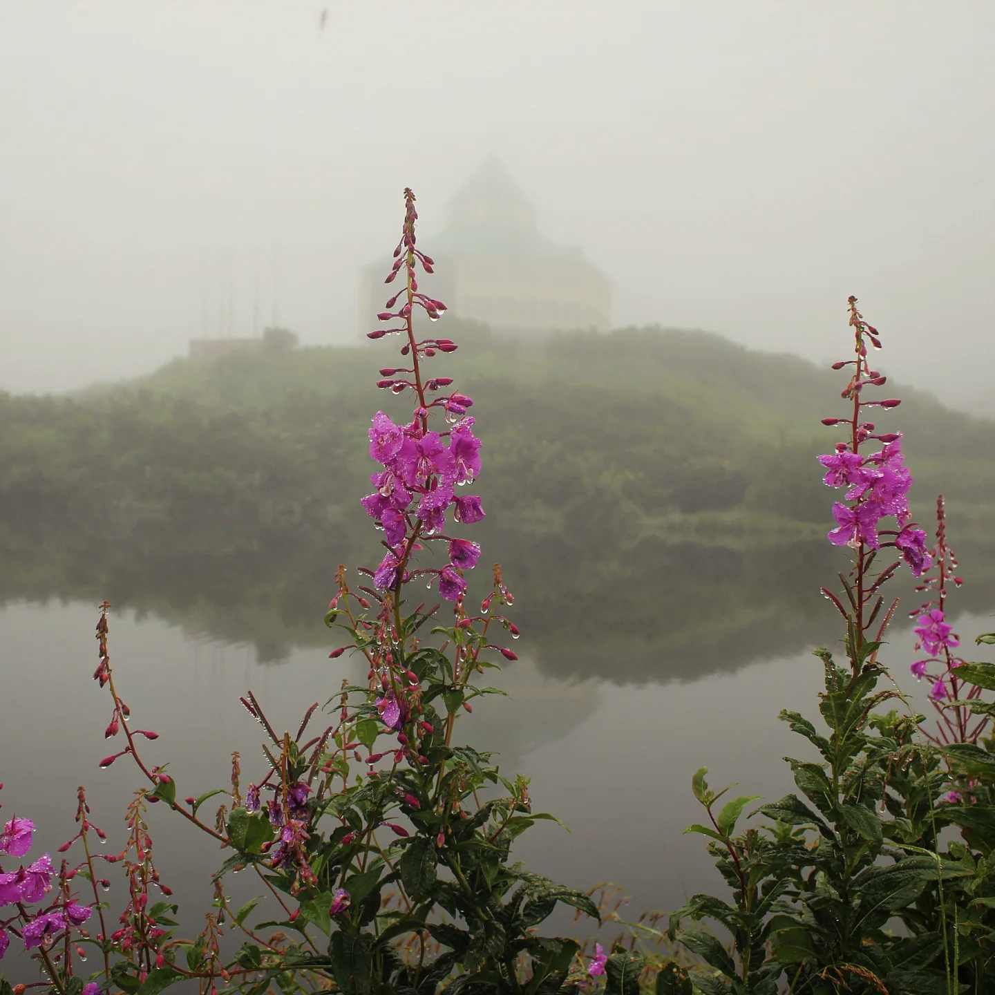 На следующий день был длинный переход к Дачным горячим источникам и Малой долине гейзеров. Я шла на морально-волевых и думала, зачем это всё мне сдалось, потому что вокруг не было видно ничего, кроме тумана, под ногами хлюпала грязь, непромокаемые ботинки медленно промокали, на голову непрерывно лился дождь, а еще мимо периодически проезжали джипы с чистыми сухими туристами. Иногда даже притормаживали, наверное, потешались над чудиками. Но ничего — в конце ждала награда в виде тех самых источников и оазиса буйной ярко-зеленой растительности. После целого дня черно-белой депрессии это была настоящая услада для глаз и души. Источники же были не особо благоустроенными: там не было переодевалок и они подванивали. Однако самое главное — вода была реально горячей, градусов 45. Так что я отмокала, как бегемот Мото-Мото, и радовалась жизни.