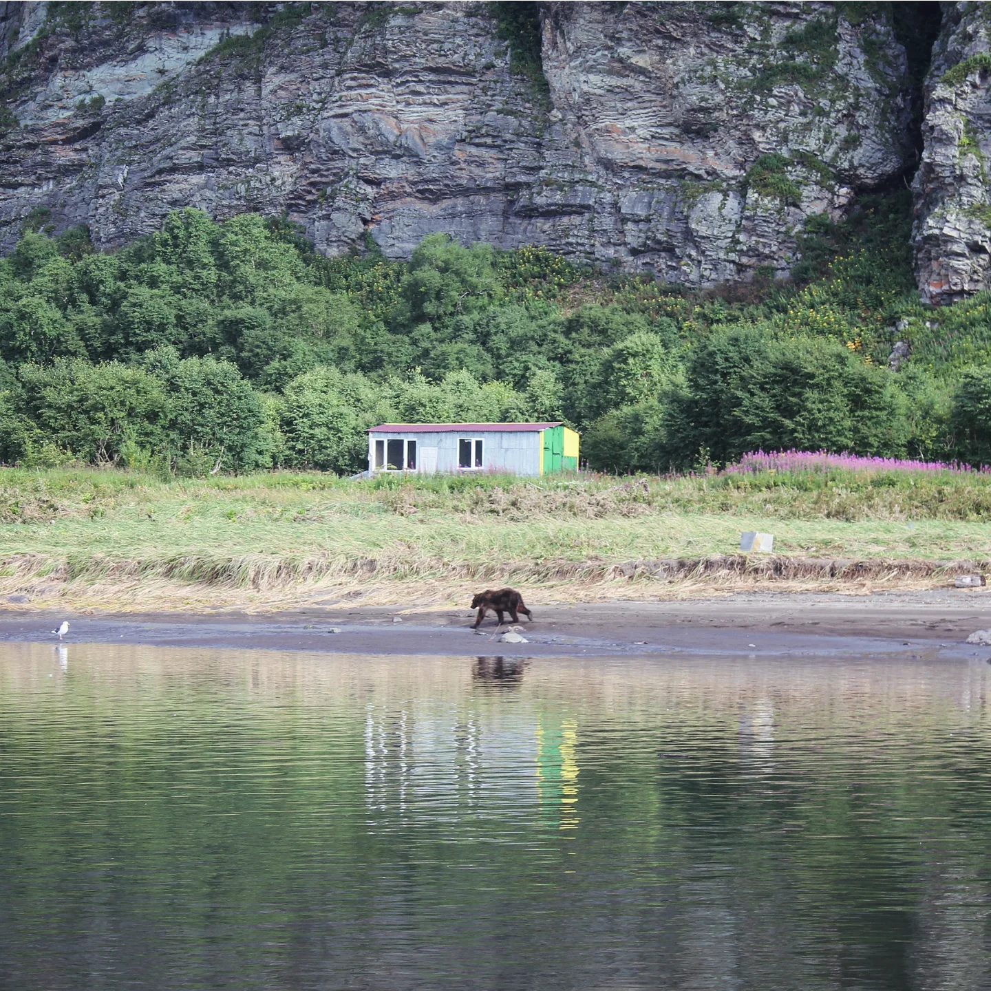 Такая встреча была не единственной, около лагеря у океана за один день мы видели примерно четырех зверей, потому что там их охотничьи угодья — они рыбачат. Самый потрясающий шанс вдоволь налюбоваться медведем выпал тогда, когда зверь вышел на песчаный берег реки, а мы стояли на другом берегу. Раньше мне никогда не доводилось вот так наблюдать за большим диким животным в среде обитания, это очень интригующе.