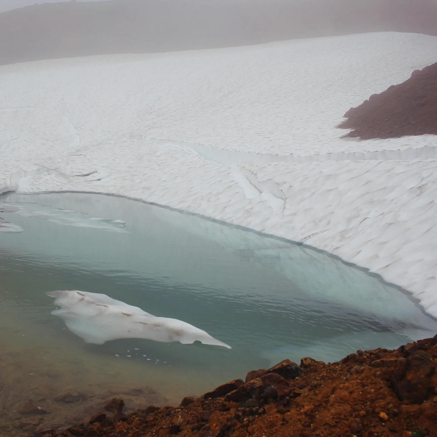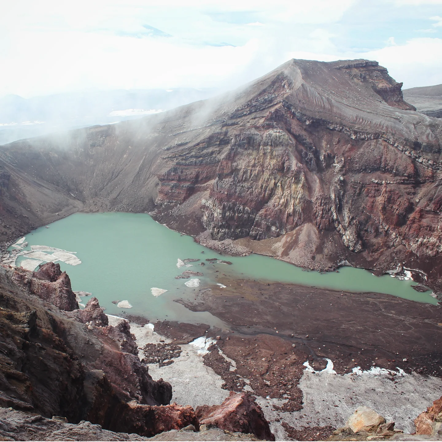 Первым делом мы поднялись на вулкан Горелый. Восхождение технически не сложное, просто надо монотонно идти вверх 2-3 часа то по страной очень черной земле, то по камням. Сначала нас окружал туман и облака, и только на вершине над нами смилостивились местные боги и стало видно озеро волшебного белёсо-зеленого цвета в кратере вулкана. Горелый — вулкан активный, когда мы шли к другим его кратерам, неоднократно видели дымящиеся зловонные фумаролы и выходы серы, иногда это было похоже на вход в преисподнюю. Очень сильное впечатление!