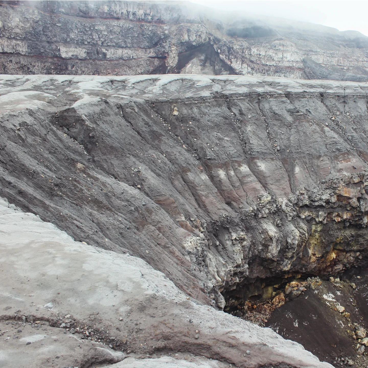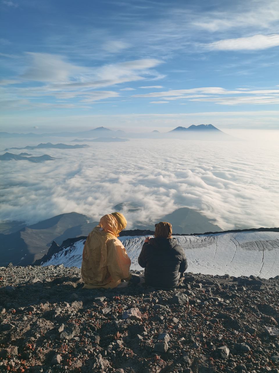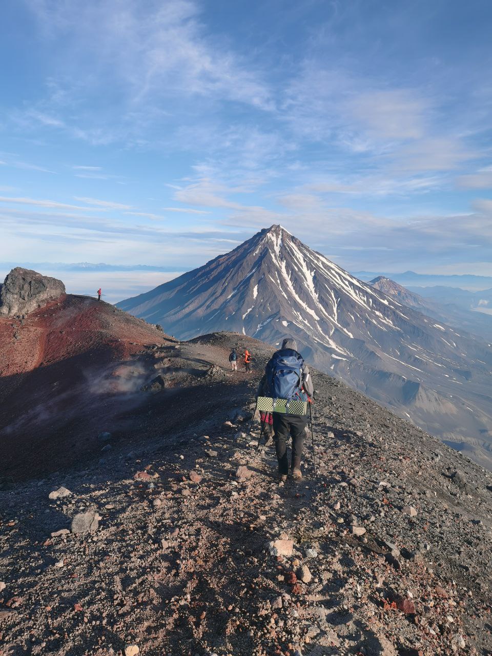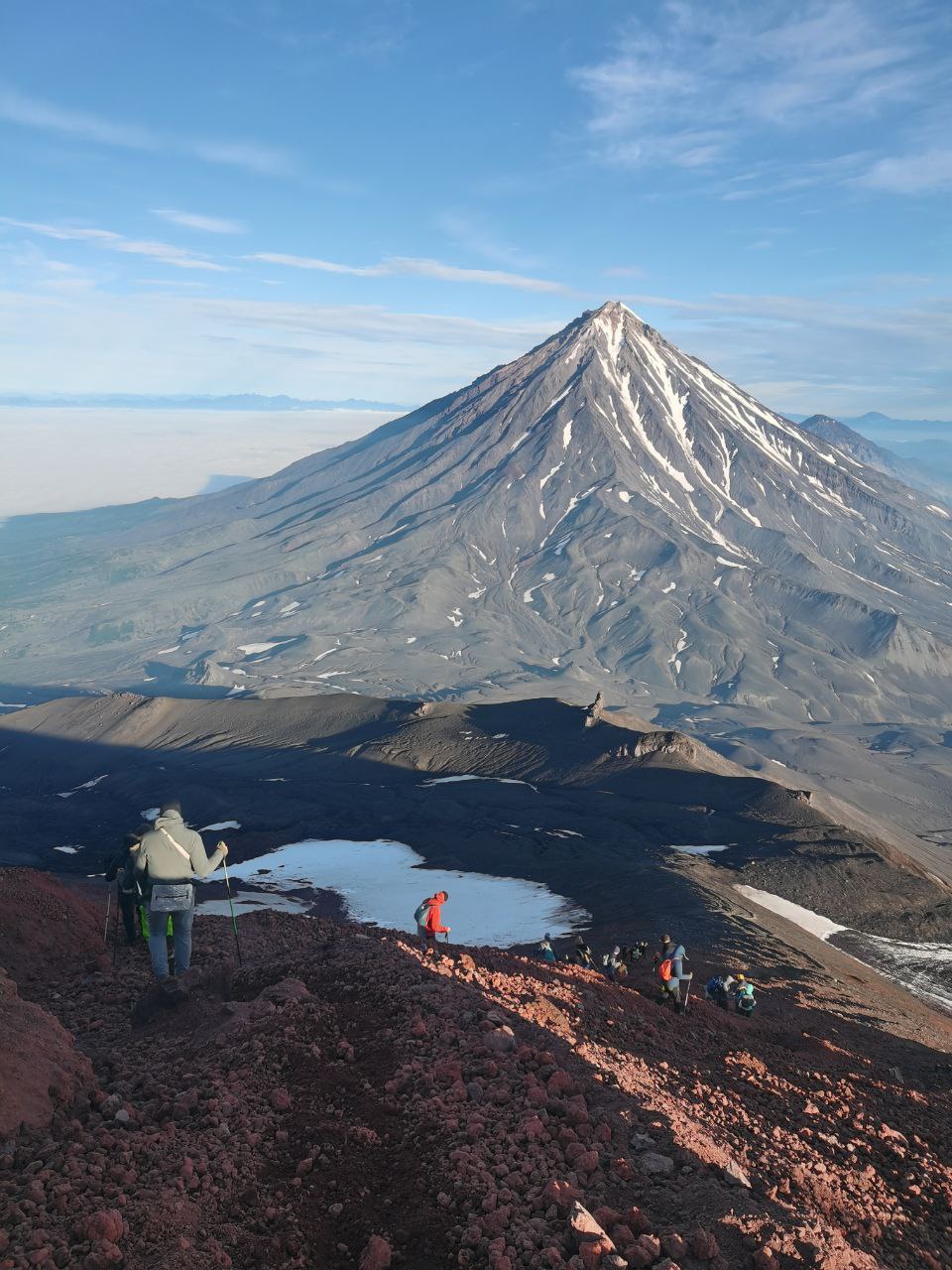 Все лишения и тяготы были забыты, когда примерно в 5 с чем-то утра мы наконец вышли на край кратера, увидели в его центре лавовую воронку, а вокруг — одеяло из облаков, которое прорезали пики других далеких гор. И самое главное — с вершины Авачинского как на ладони виден гордый Корякский вулкан, с крутыми склонами, идеальной конусообразной формы.