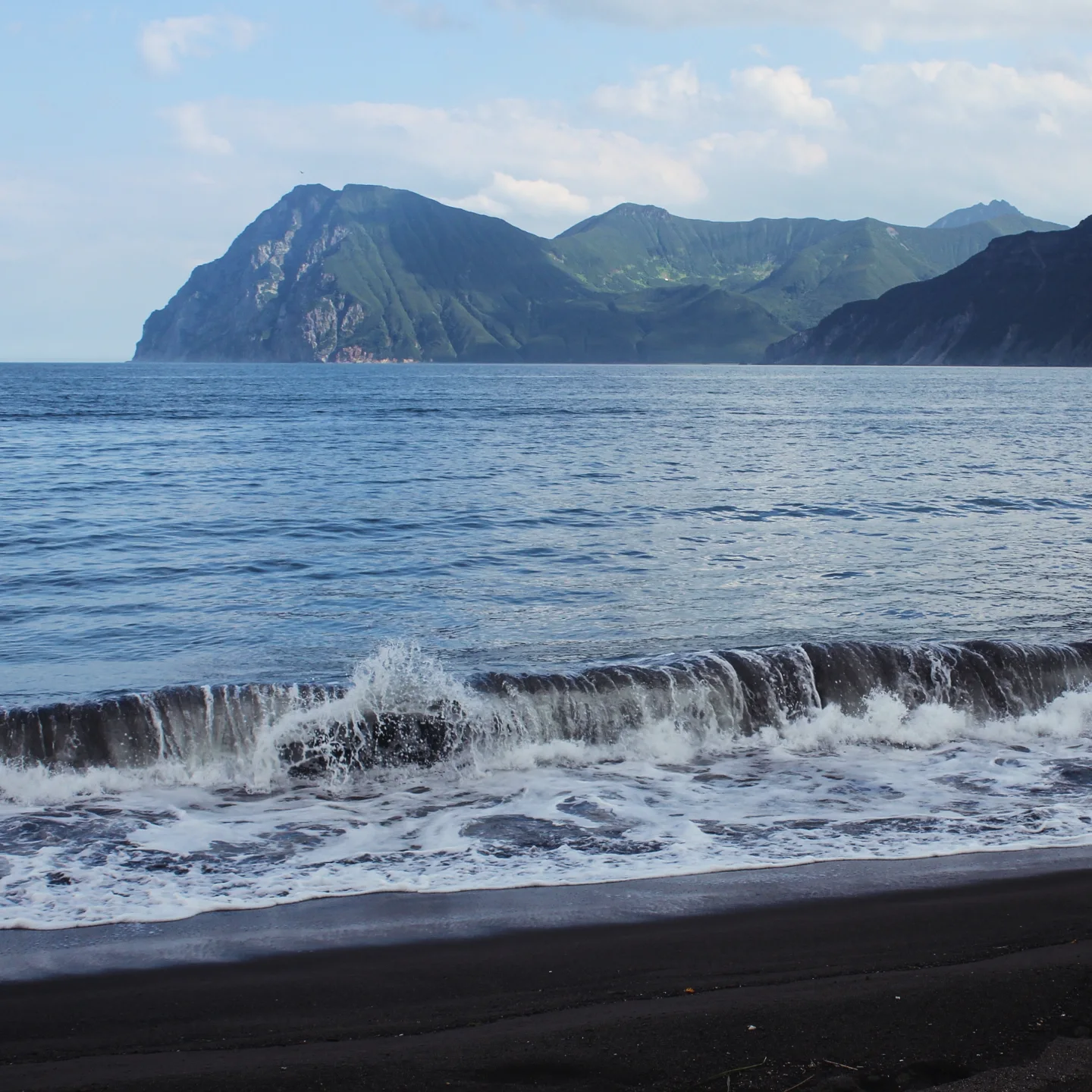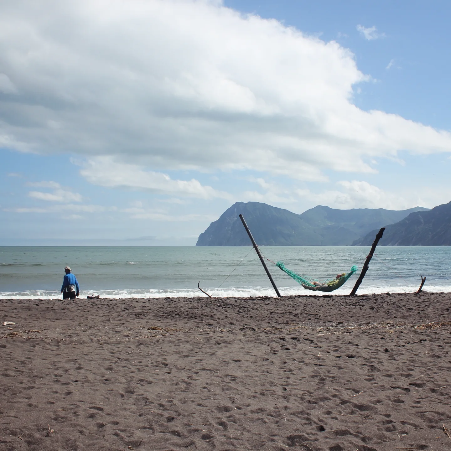 Уже из последних сил в час ночи мы дотащились до пляжа, под дождем в кромешной тьме поставили лагерь, поэтому долгожданное знакомство с океаном наконец состоялось утром. О, это чувство — откинуть полог палатки и увидеть скалы, замыкающие бухту, а между ними — зелено-синюю океанскую гладь до самого горизонта и волны, бросающиеся на черный песок. В тот день вся наша группа пребывала в мечтательно-дремотном состоянии, мы сидели у воды, любовались видом, некоторые рыбачили, кто-то занимался йогой, а еще установили гамак и все в него по очереди залегали и делали фото красивой жизни.