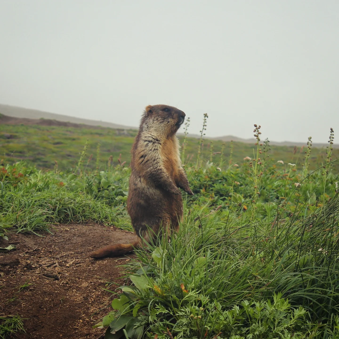 Помимо любования видами, довелось увидеть и нескольких животных. Во время печальной прогулки к водопаду у края дороги заметили симпатичного упитанного зверя типа сурка, не помню его правильное название. Он умильно позировал, в какой-то момент привстал на задние лапки, а потом с удивительной для своей комплекции скоростью убежал.