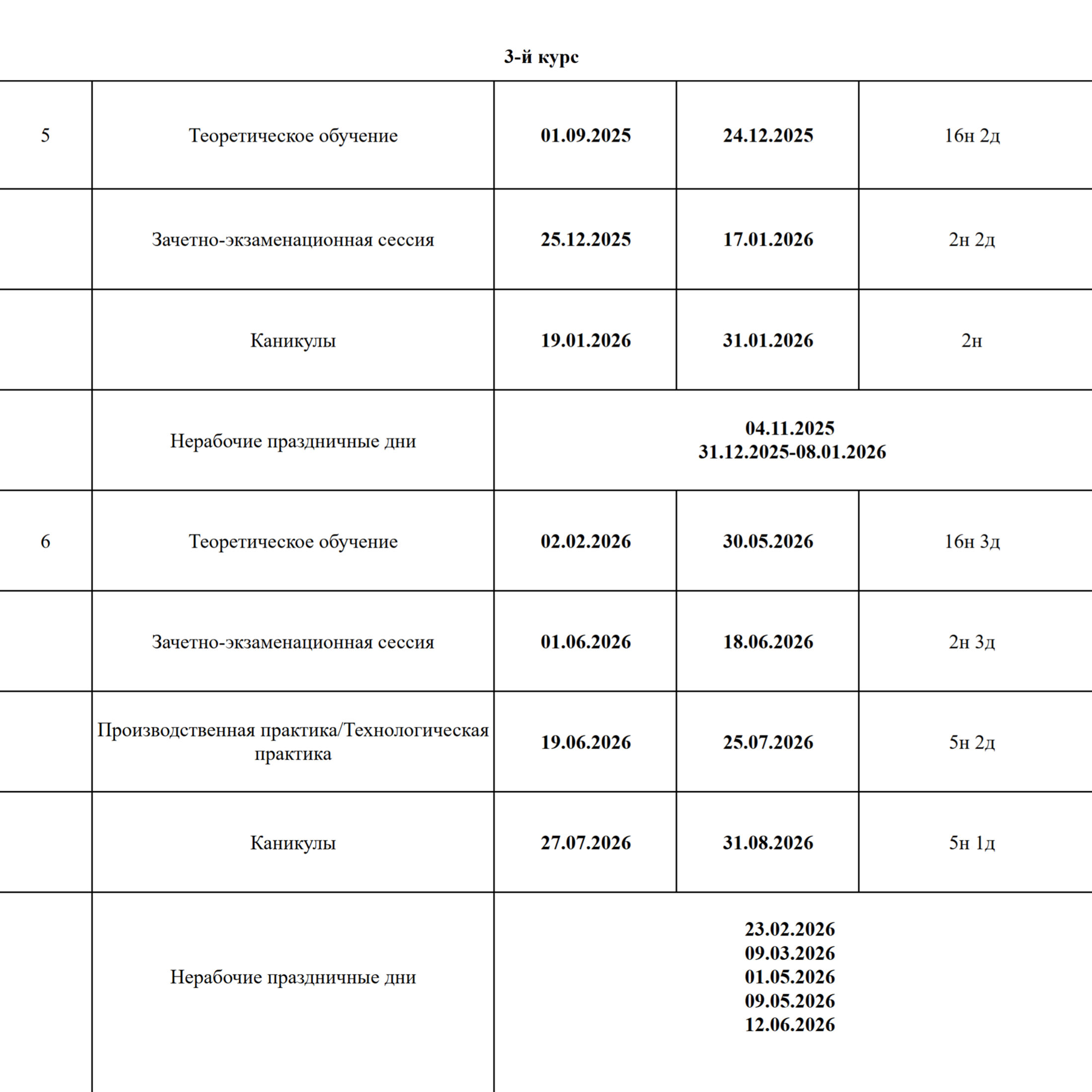 Общего расписания каникул нет, и даже на разных курсах одной специальности даты могут различаться.