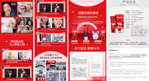 На примере Colgate видно, что карточка на Tmall строится слоями. Сначала пользователь получает общий коммерческий сигнал: что это за продукт и в чем его обещаемый эффект. Затем страница постепенно добавляет детали — как именно работает продукт, за счет чего достигается результат, как он выглядит в использовании и какие дополнительные преимущества предлагает бренд. По мере скролла карточка становится не длиннее ради объема, а убедительнее: каждый следующий блок добавляет новый аргумент в пользу покупки.