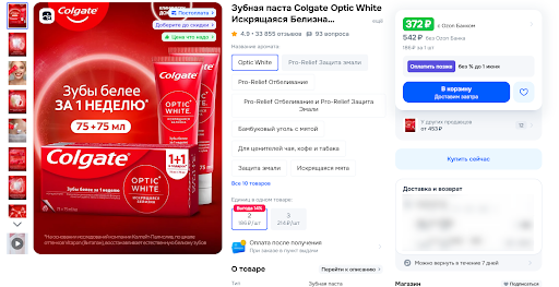 На Ozon тот же продукт оформлен в более стандартной логике. Первый экран здесь организован по структуре, схожей с Tmall: главное фото, цена, рейтинг, количество отзывов, варианты товара, блок доставки и возврата, кнопки покупки.